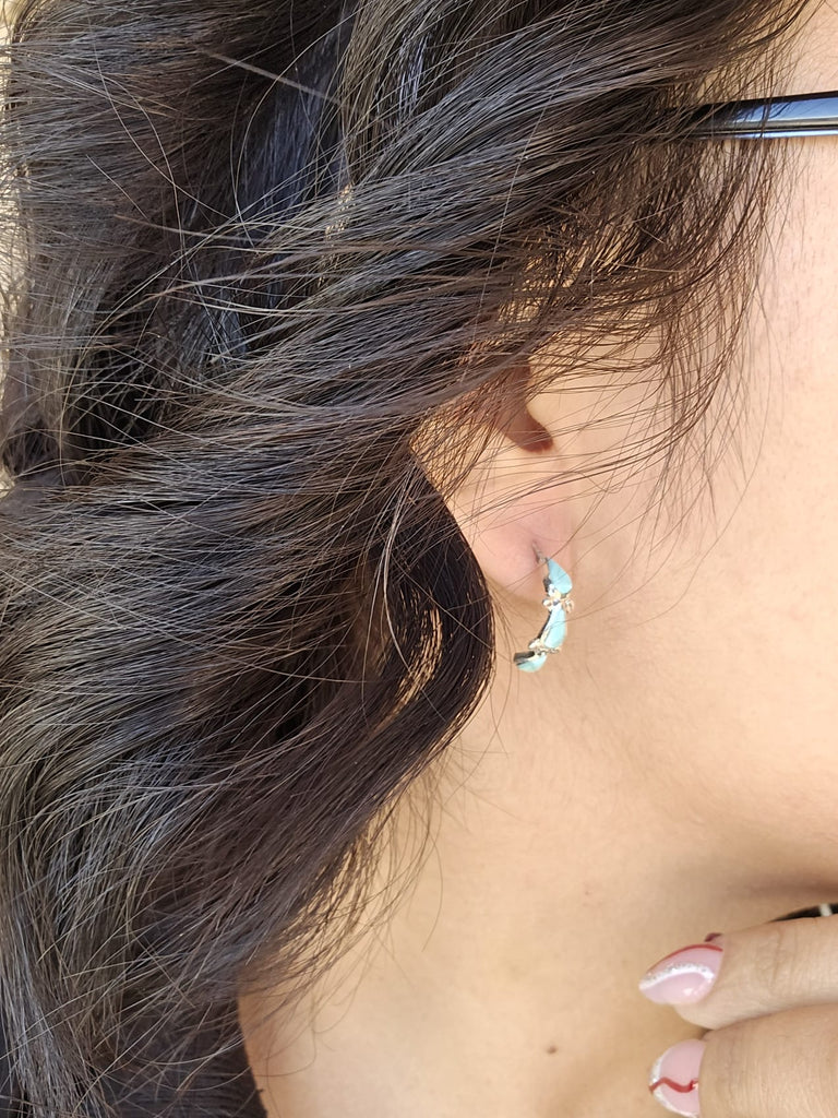 Absolutely adorable huggie style earrings with sweet teardrop shaped Turquoise stones set in 925 Sterling Silver open backed hoops.