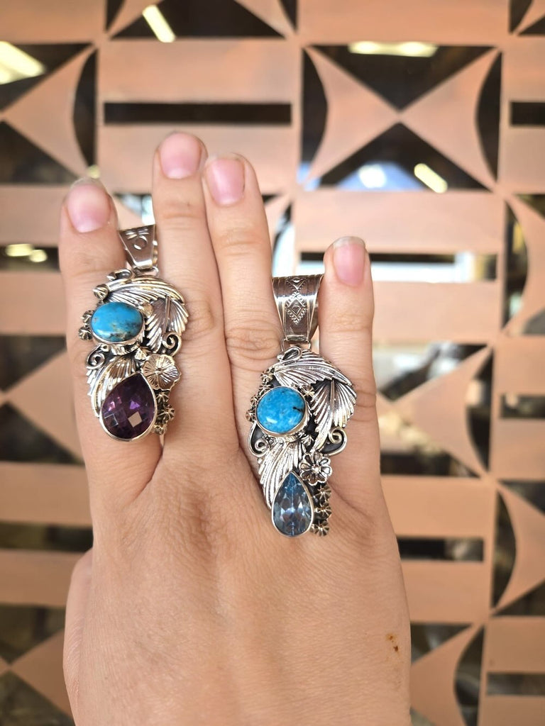 Stunning ornate Sterling Silver pendant with intricate nature-inspired metalwork embellished with a large Blue Turquoise stone and your choice of either Swiss Blue Topaz or Amethyst.