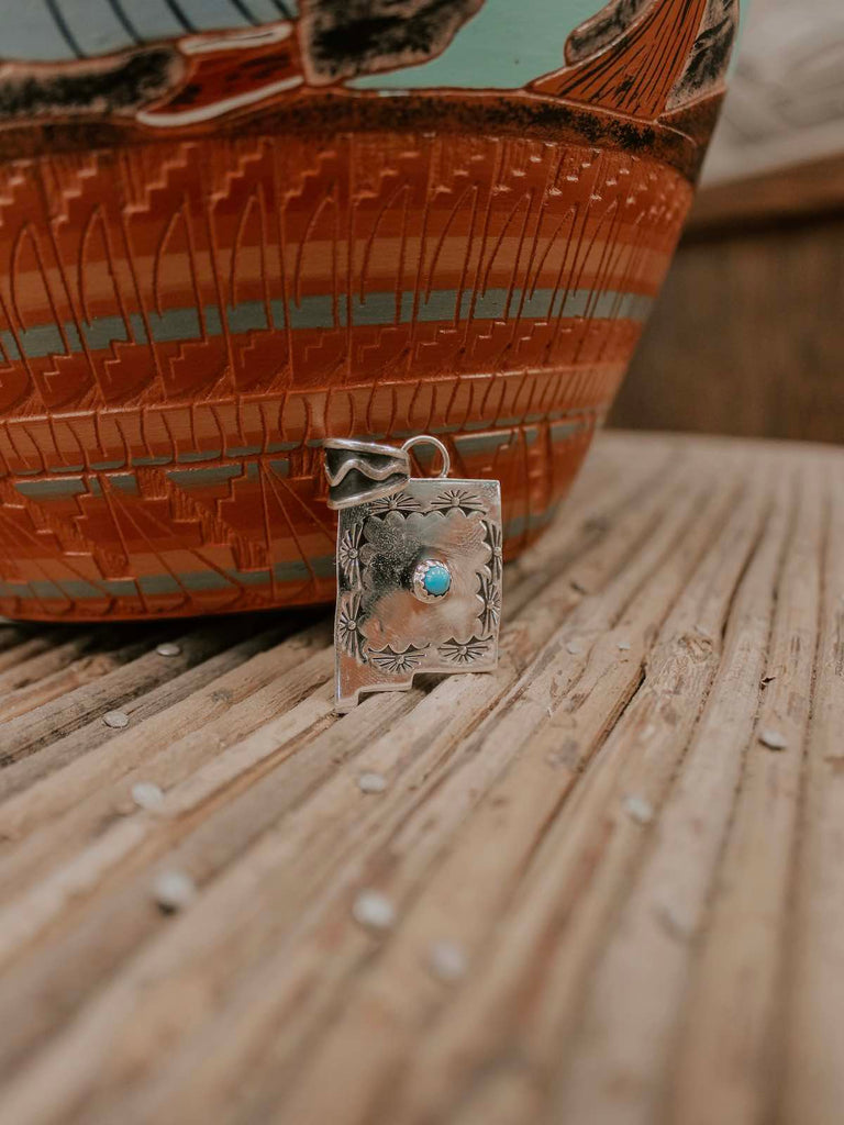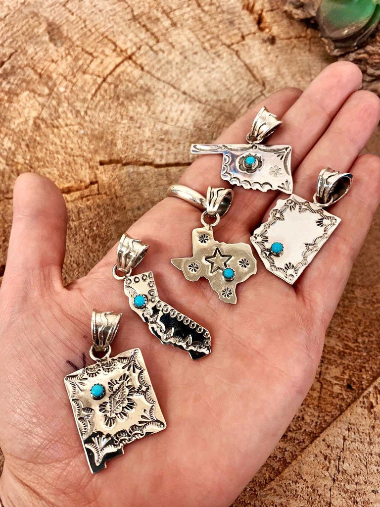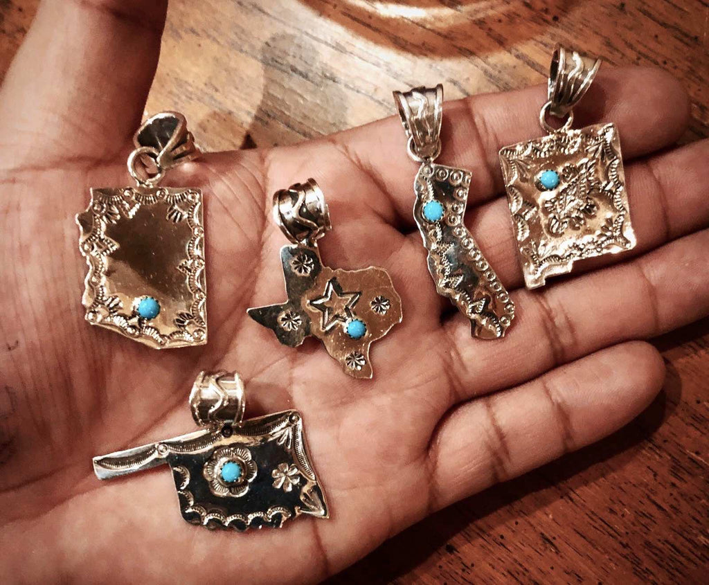 Hand-crafted in Sterling Silver, cut out to the state shape with a stone on the capital.