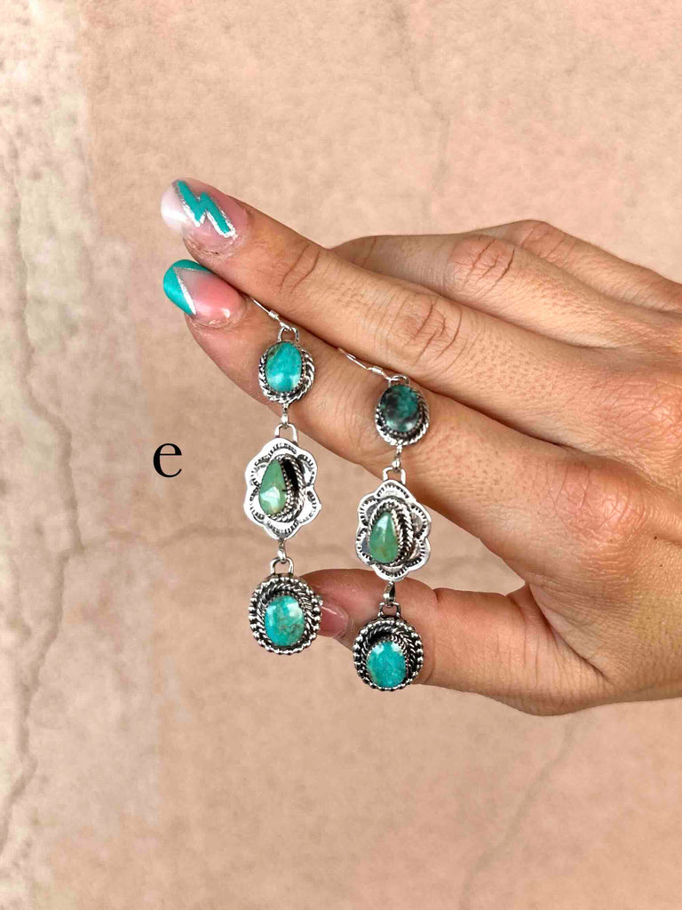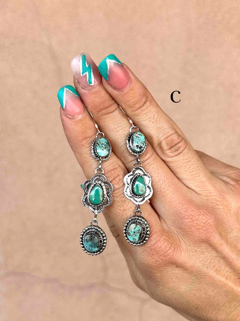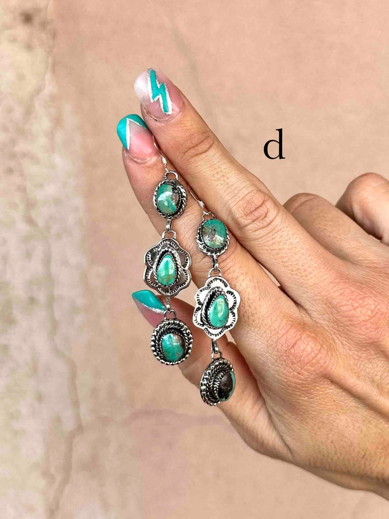 Beautifulllll hand-crafted dangle earrings with 3 hand-cut Turquoise stones and funky metalwork. 925 Sterling Silver.