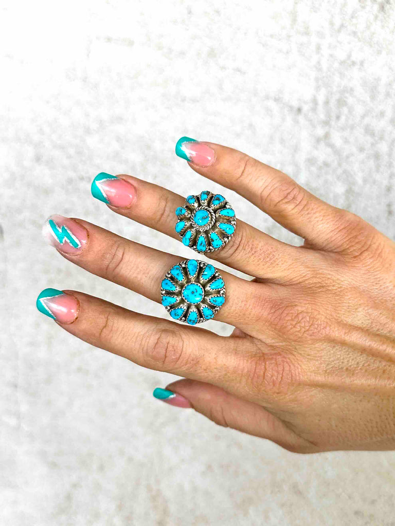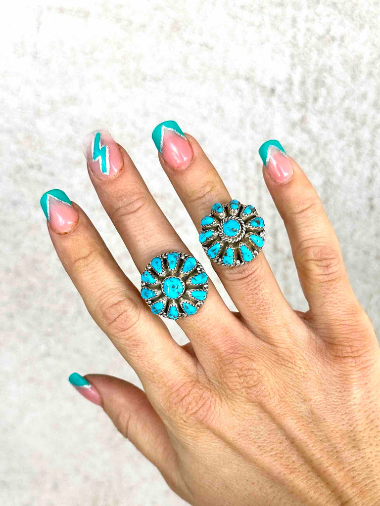 Beautiful Turquoise cluster ring, with a raised profile for maximum effect. Only two available, each with beautiful matrix flecked Turquoise stones.