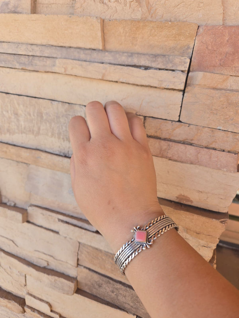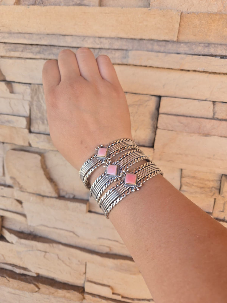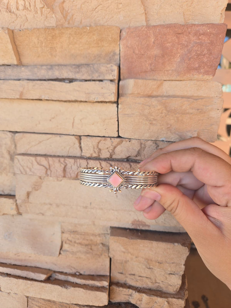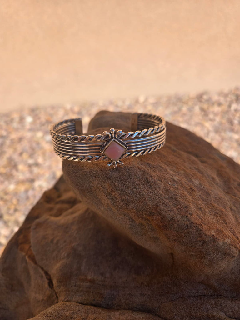 Stunning hand-crafted 925 Sterling Silver cuff with hand cut Genuine Pink Shell center stone, and quality thick band.