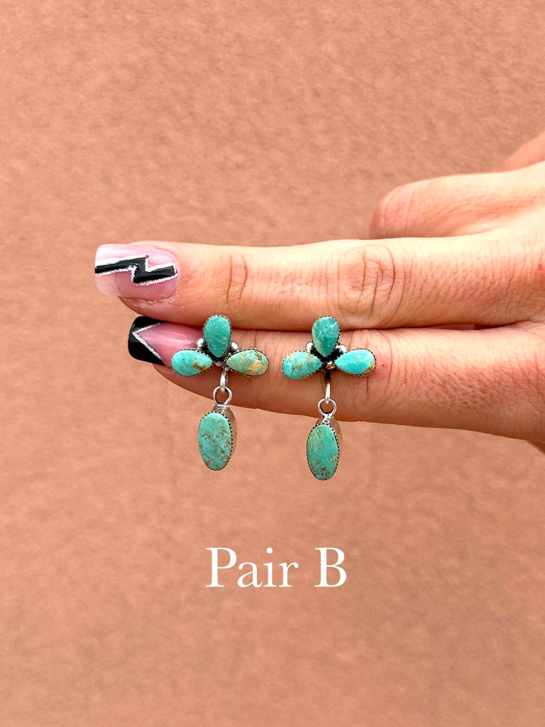 4 hand-cut genuine Turquoise stones in Sterling Silver with one cute dangle.