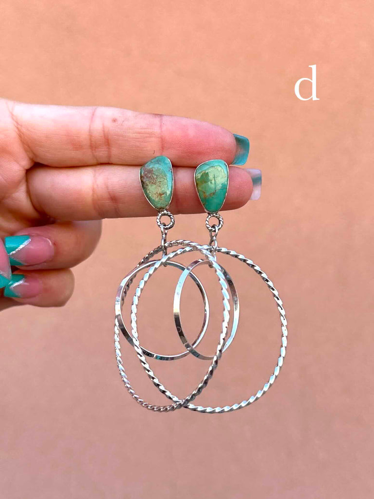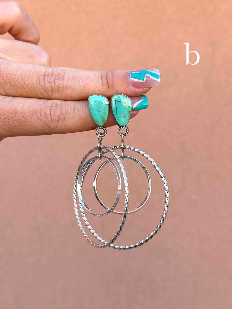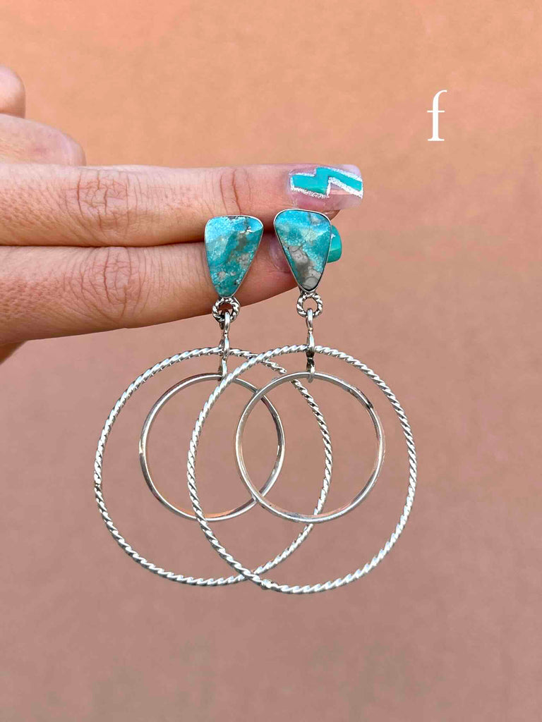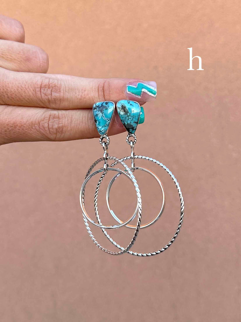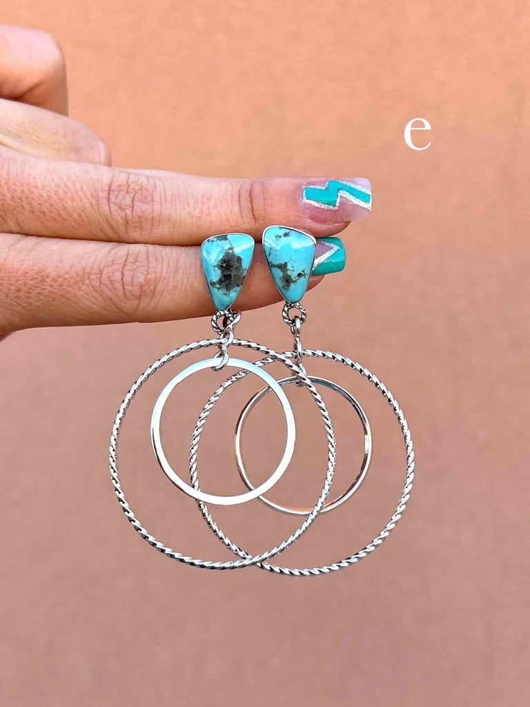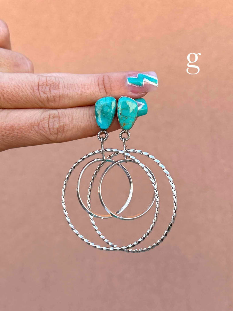 Stunning Sterling Silver hoop earrings with genuine Turquoise stones, with gorgeous concentric double hoops.