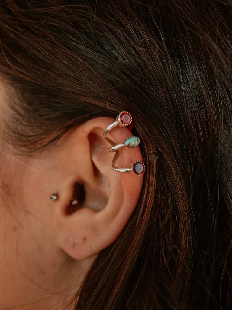 Two Garnets and 1 Turquoise stone complement each other on this super sweet ear cuff, crafted from 925 Sterling Silver in New Mexico.
