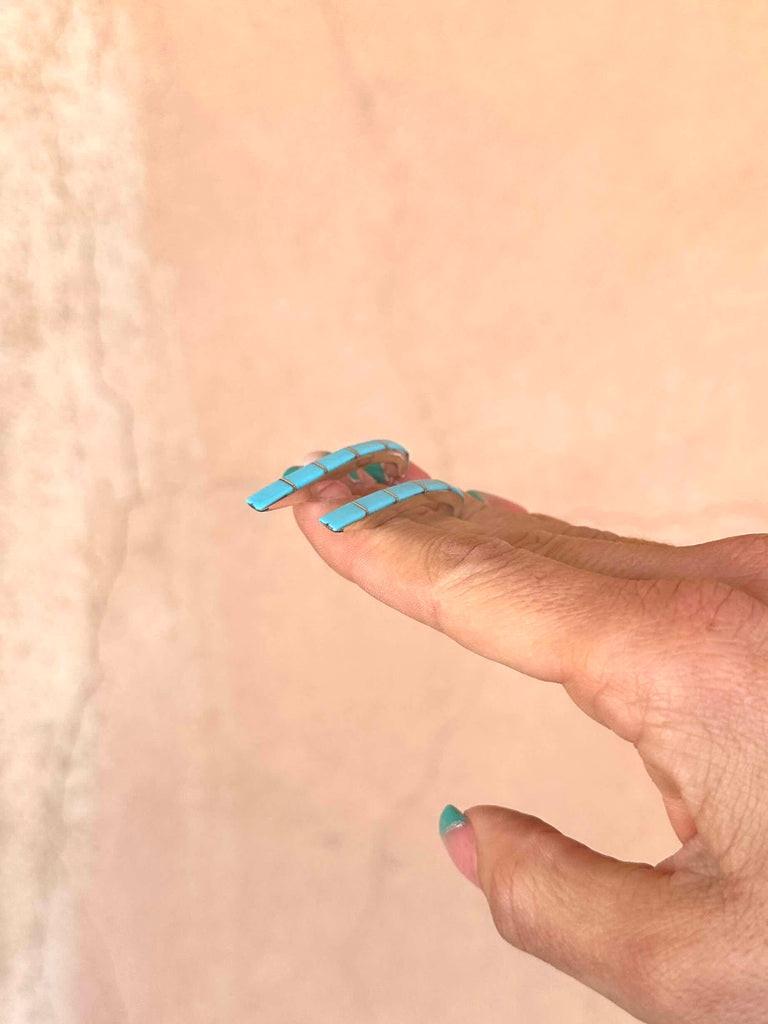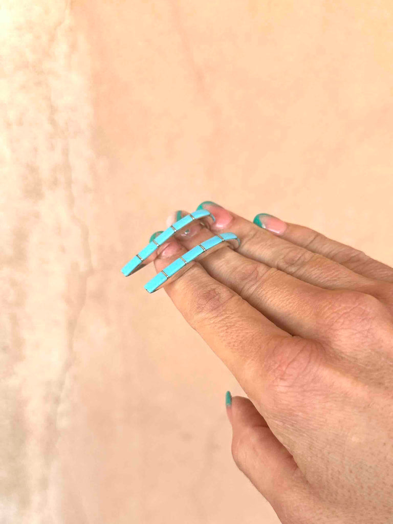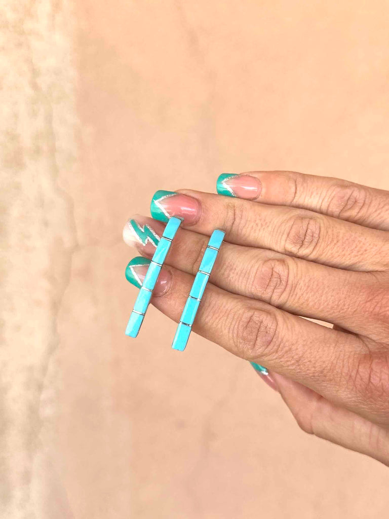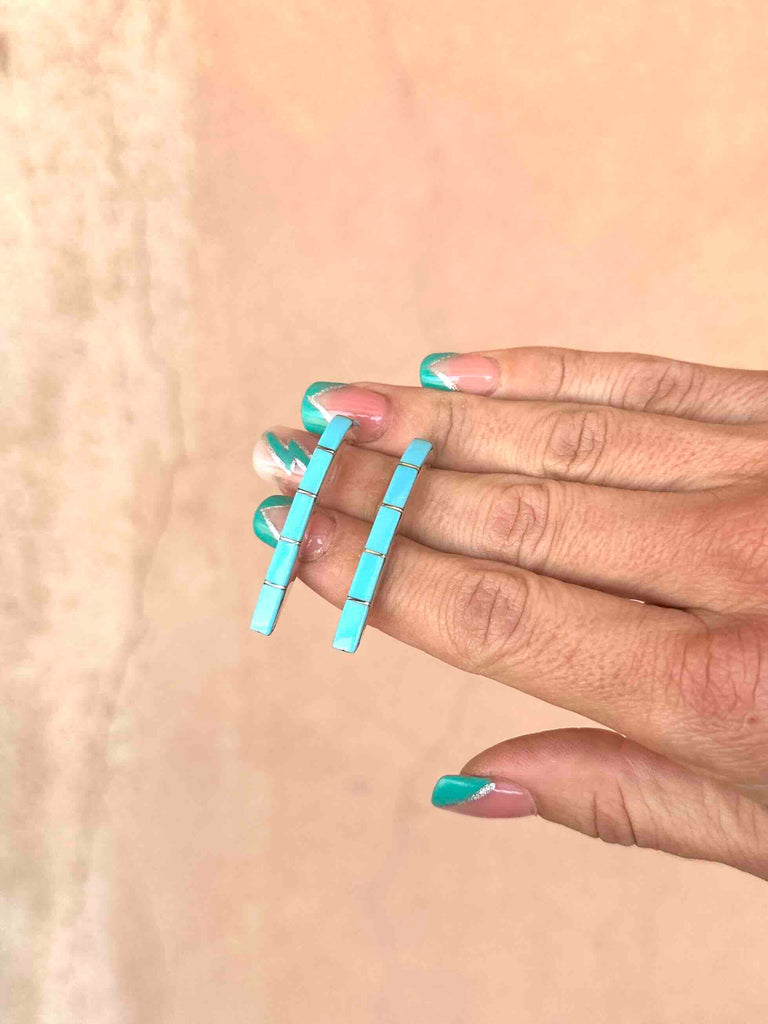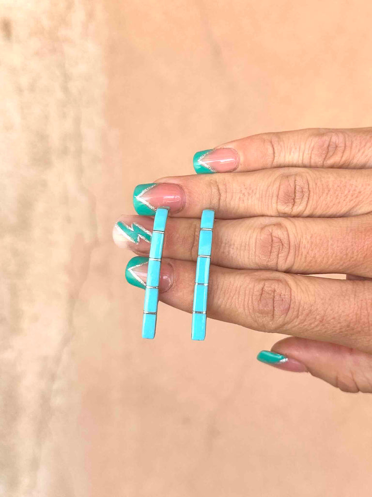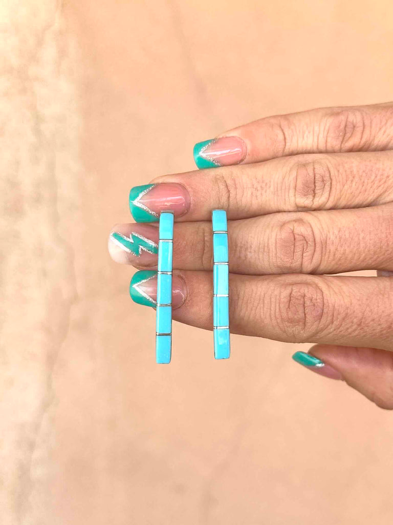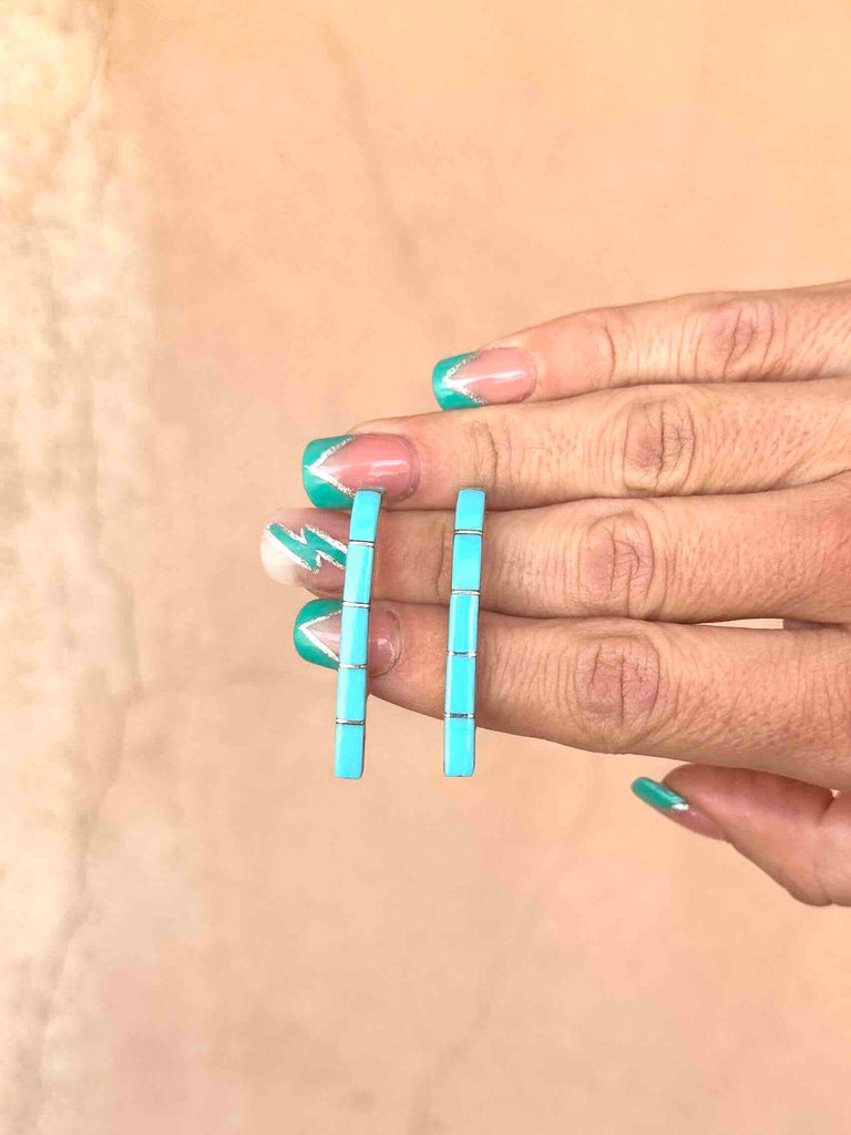 Love these showstopper earrings featuring a vertical drop of Turquoise inlaid in 925 Sterling Silver.