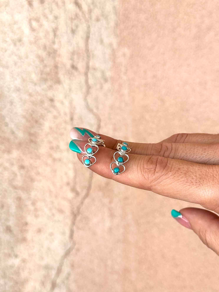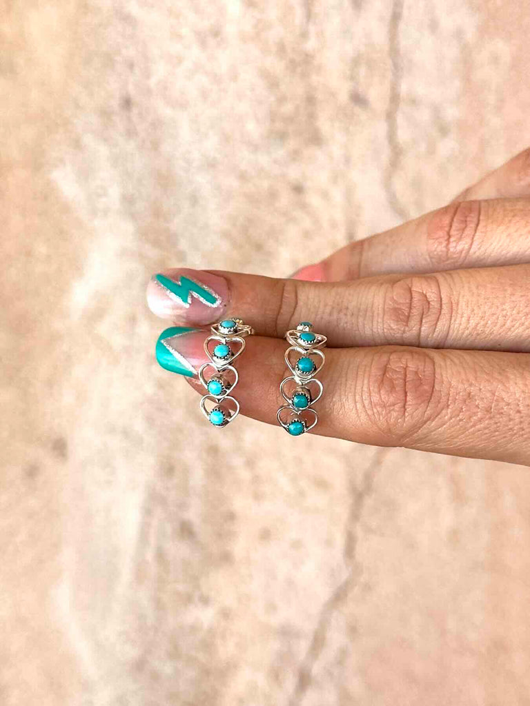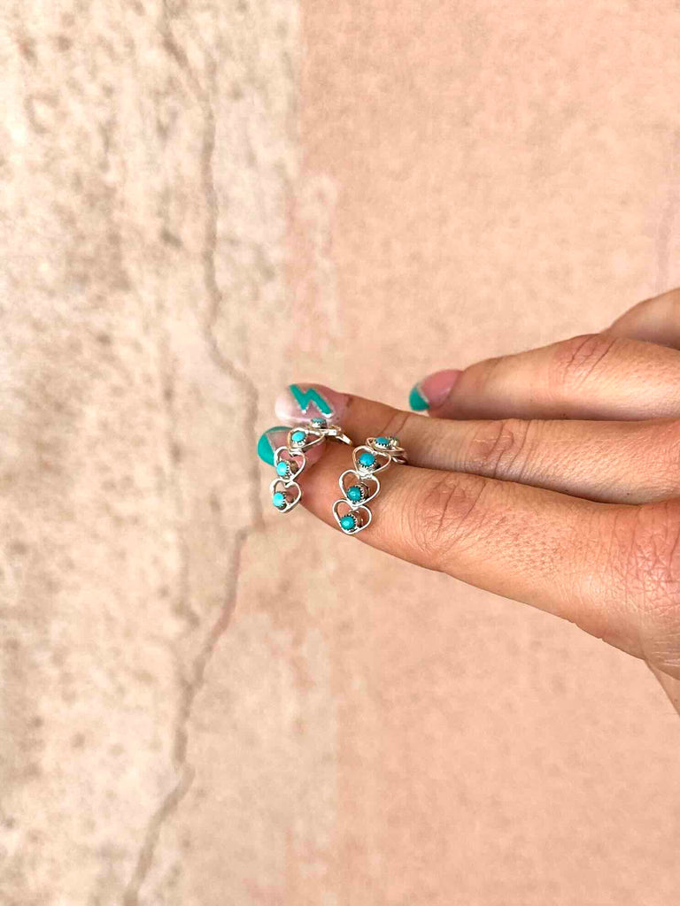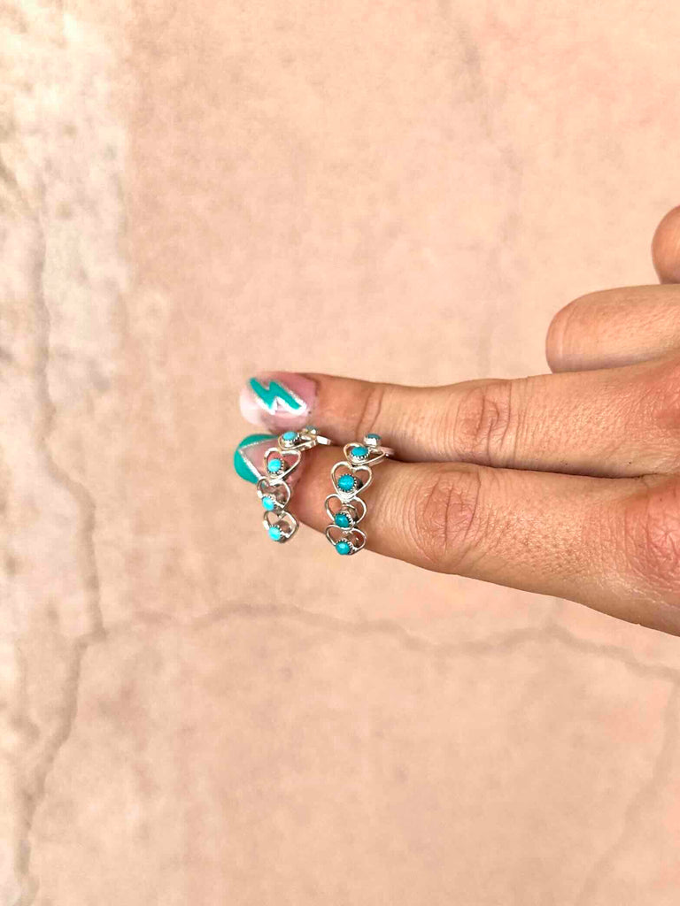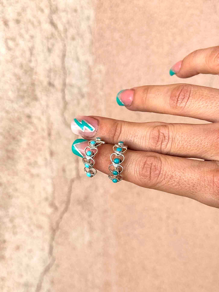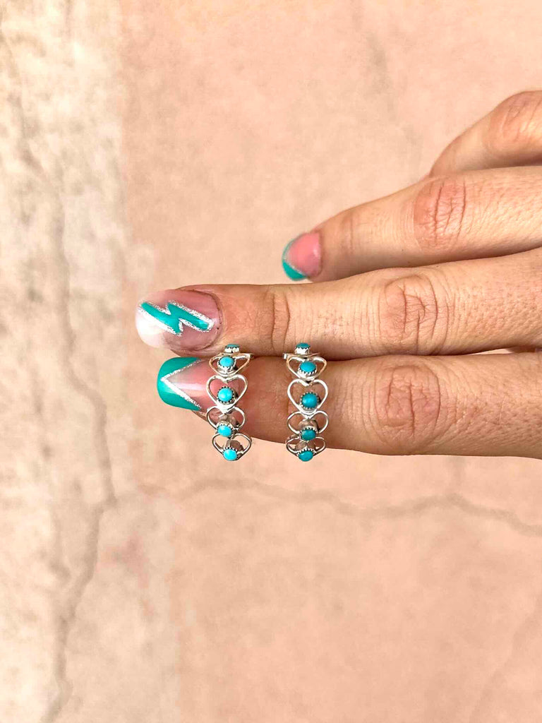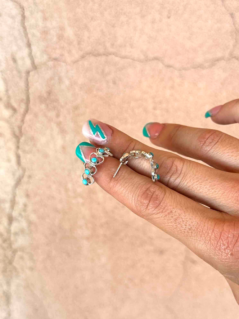 The sweetest huggie style earrings made up of teeny 925 Sterling Silver hearts and studded with real Turquoise stones.