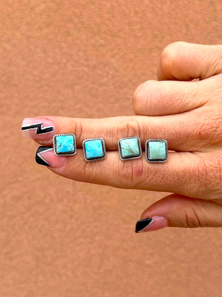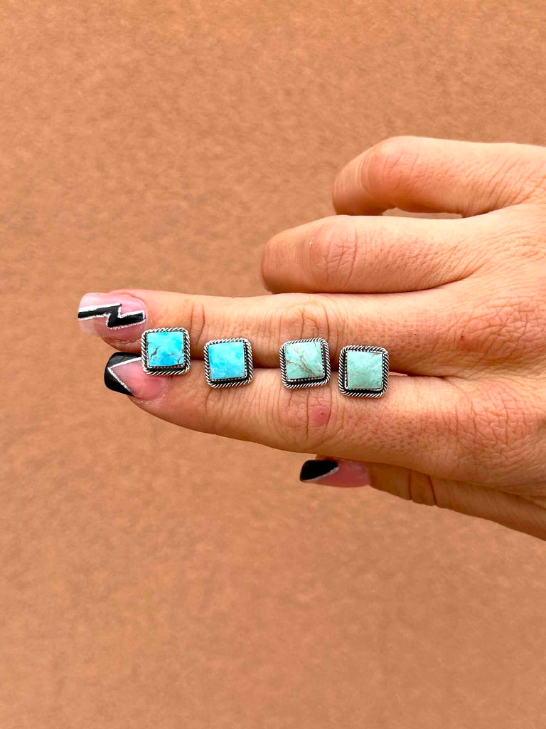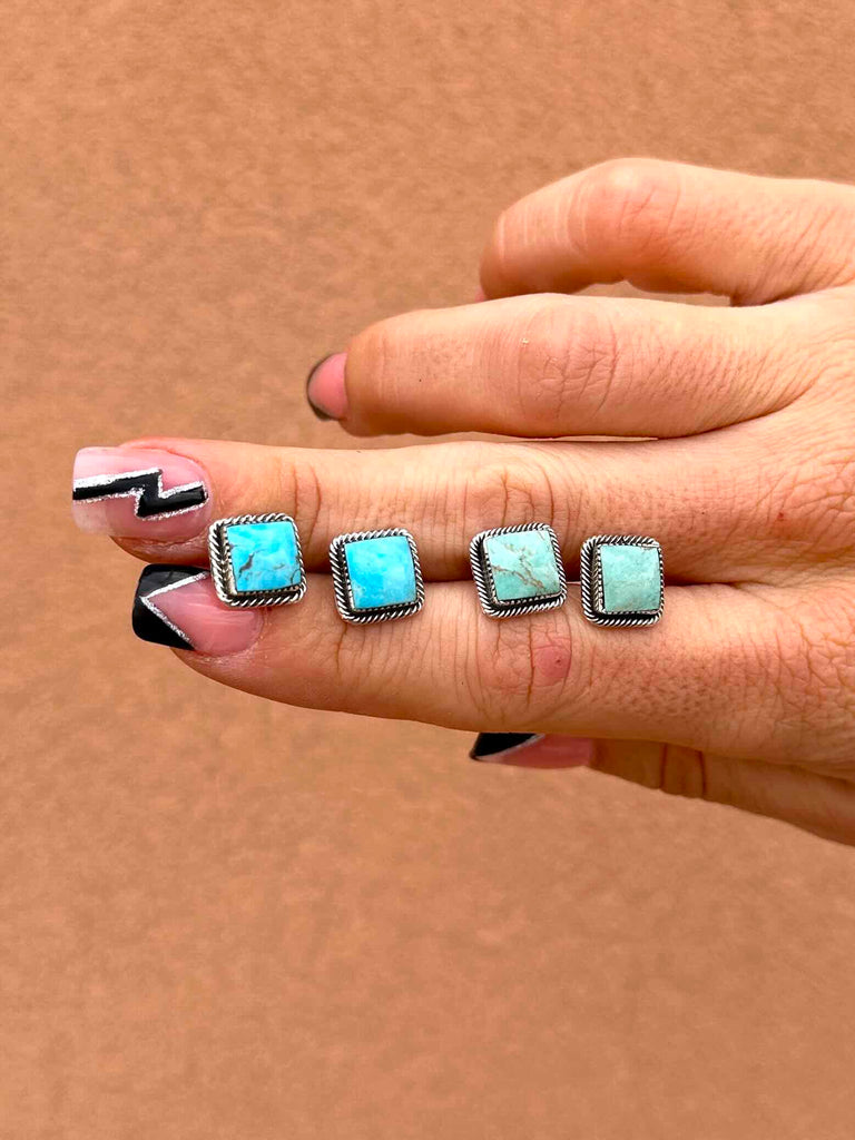 925 Sterling Silver stud earrings with twisted frame, and genuine center Turquoise stones.