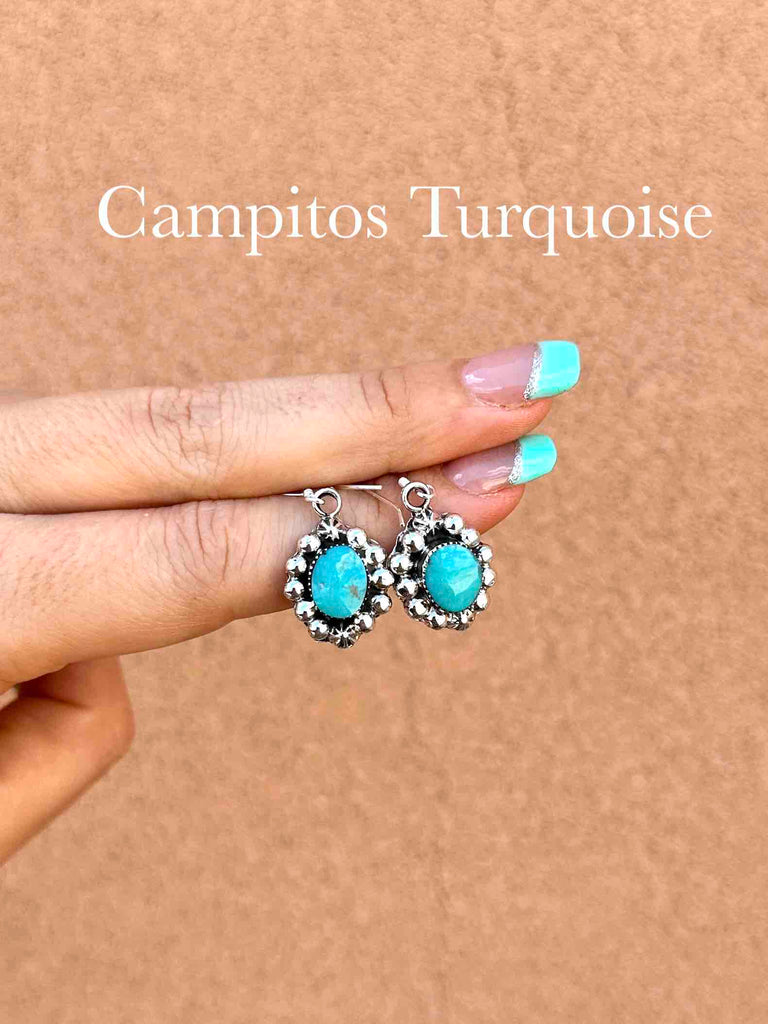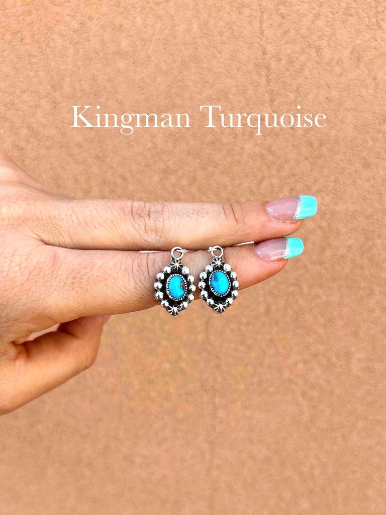 Handcrafted 925 Sterling Silver earrings with your choice of hand-cut Kingman or Campitos Turquoise, or White Buffalo stones.