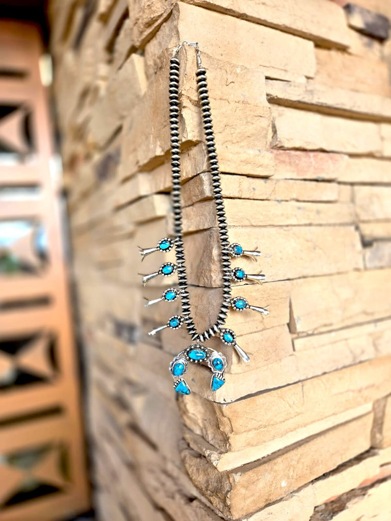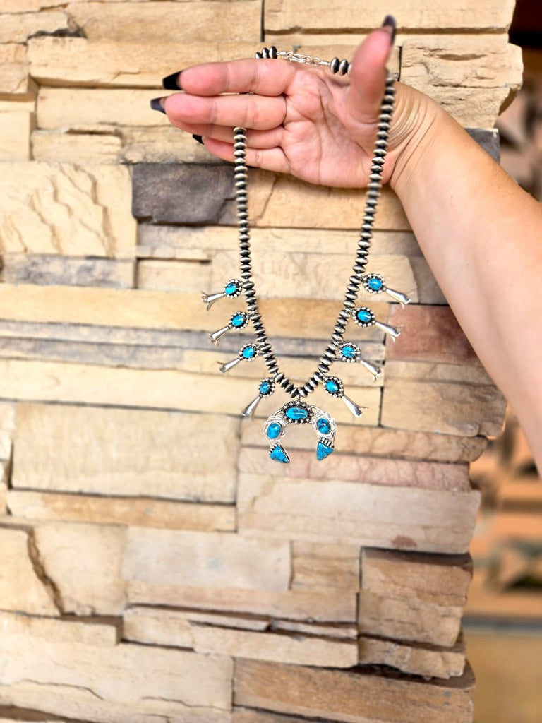 This limited edition necklace is SO beautiful, featuring 925 Sterling Silver Navajo Pearls adorned with beautiful Turquoise Squash Blossom pendants.