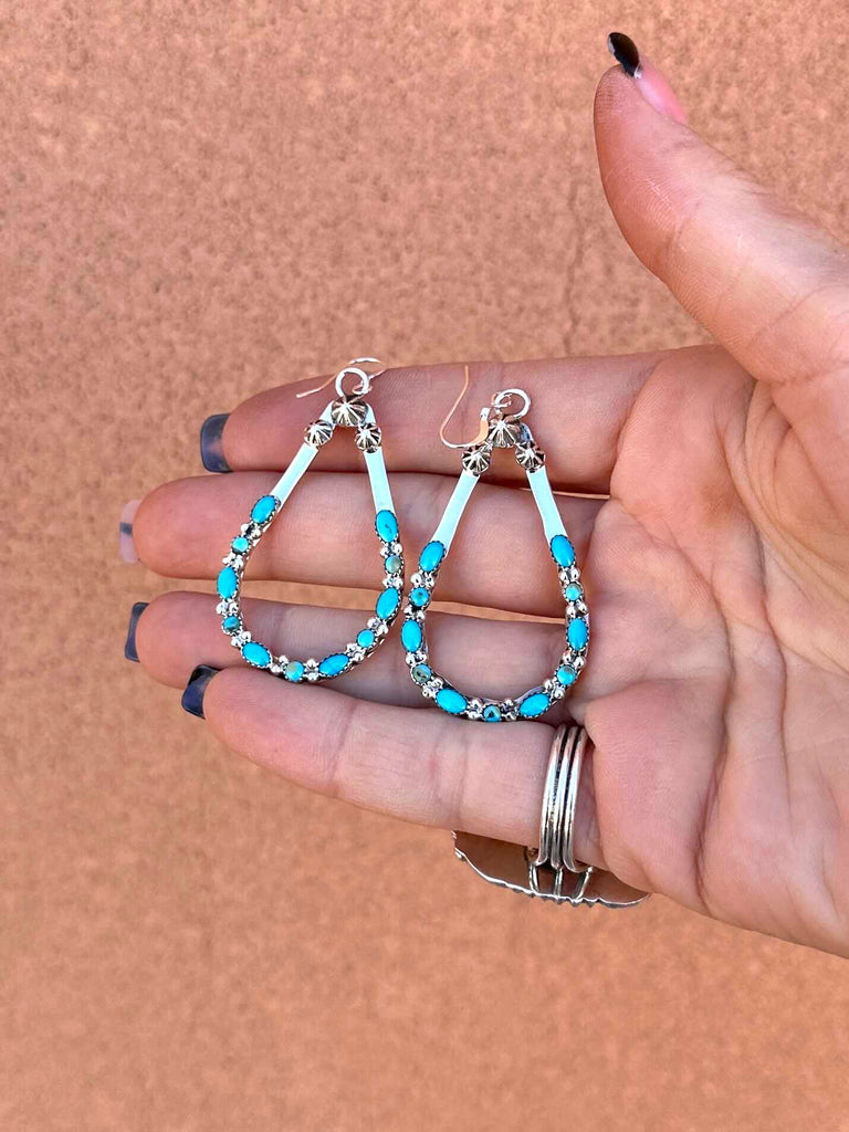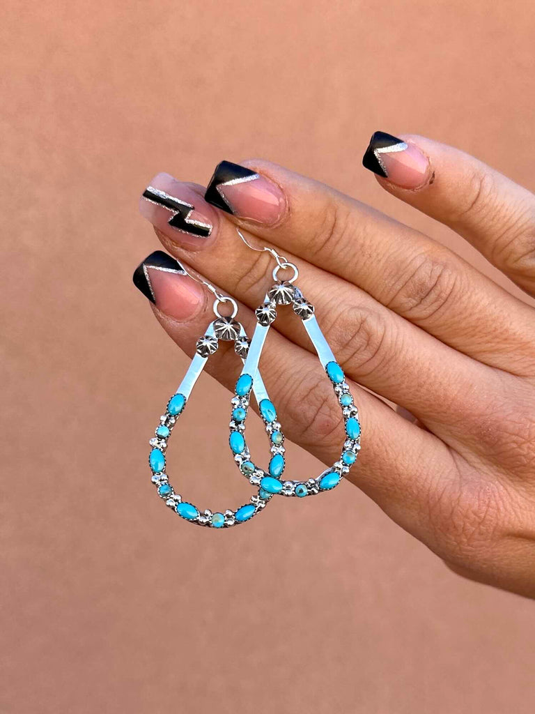 Crafted in 925 Sterling Silver - the hoops feature gorgeous starburst silverwork at the top, with the base inlaid with alternating oval and circular mini Turquoise stones.
