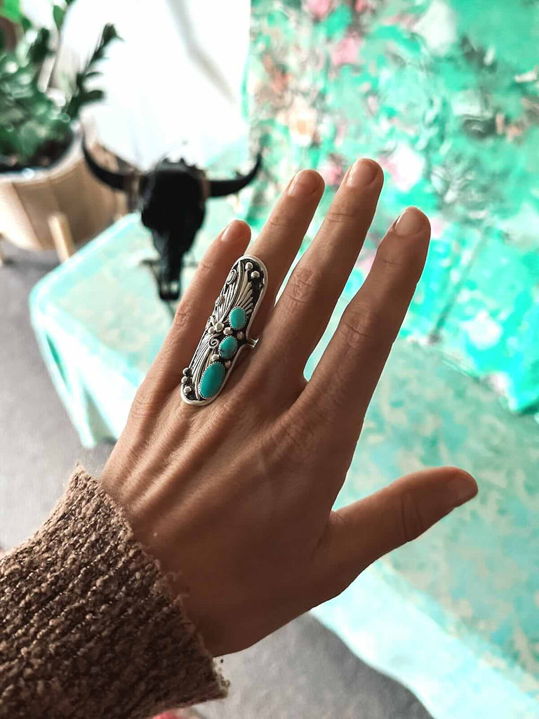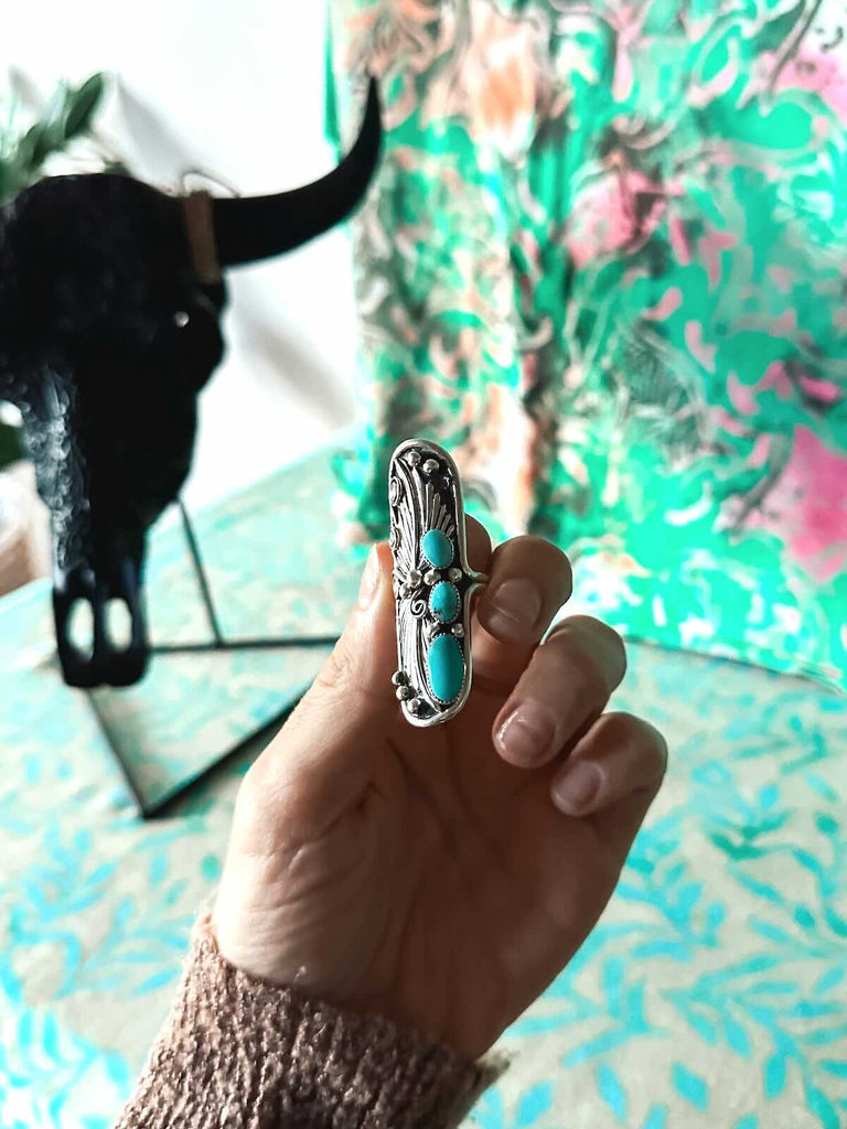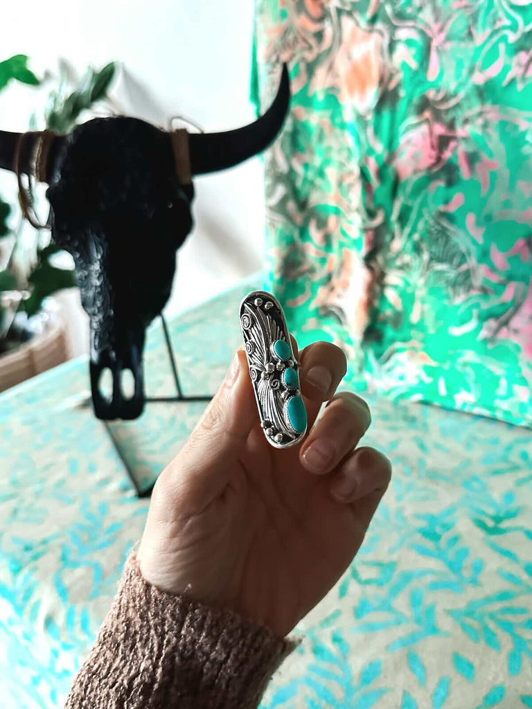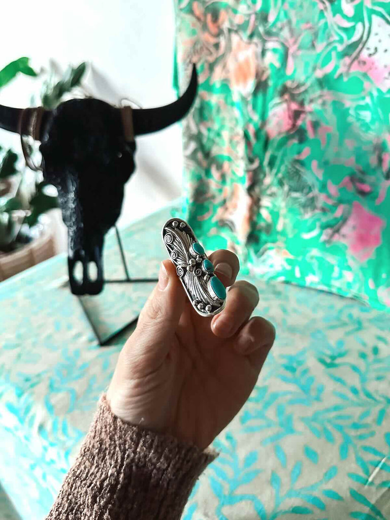 925 sterling silver with stunning handcrafted silverwork, with 3 hand set (and cut) Campitos Turquoise stones.