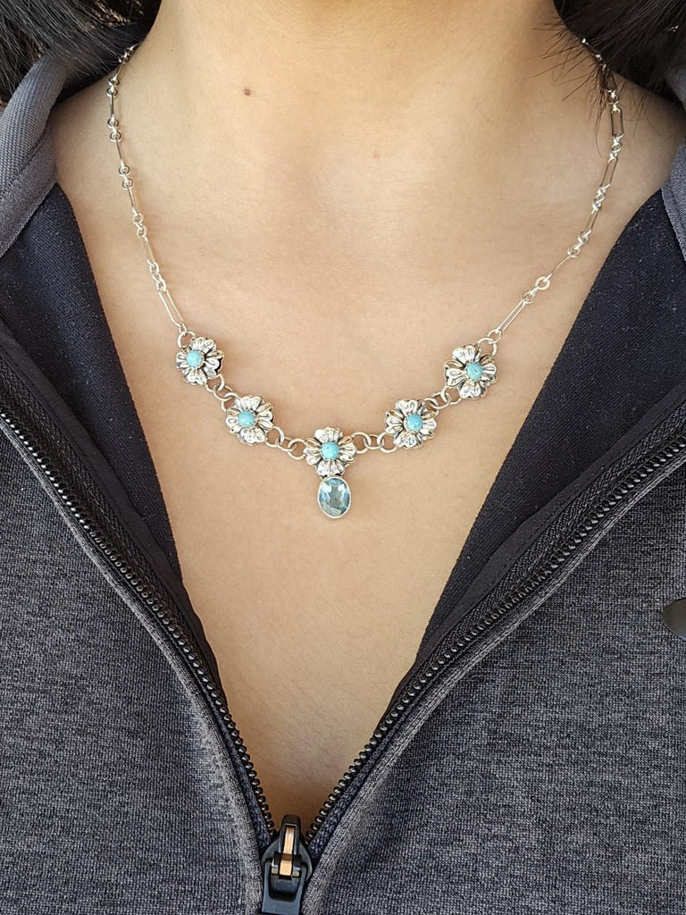 Such an ADORABLE necklace - gorgeous flower medallions studded with rare Sleeping Beauty Turquoise center stones, and with a faceted Swiss Blue Topaz stone dangle.