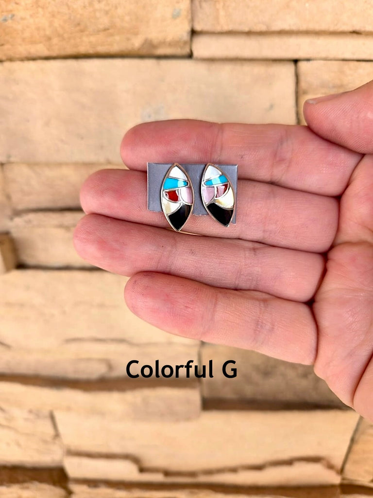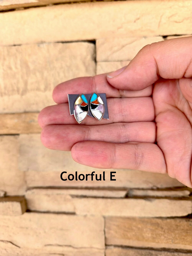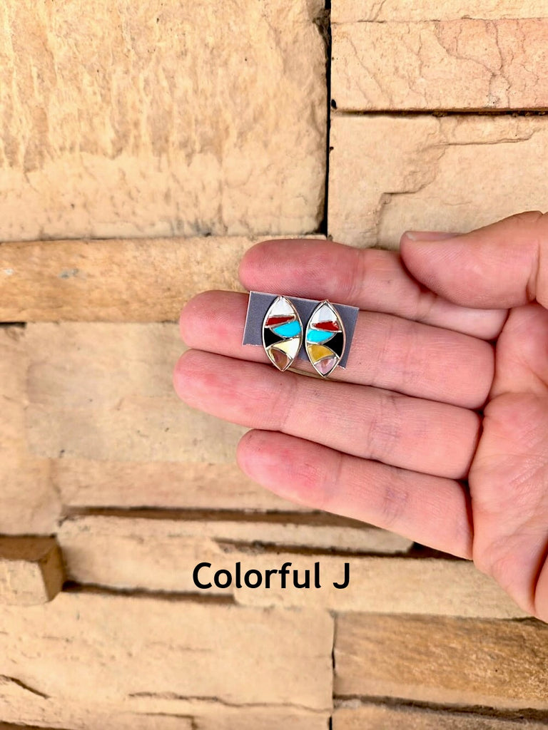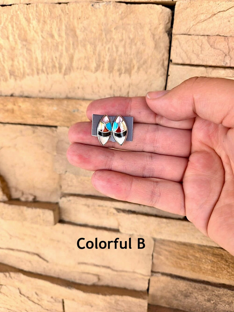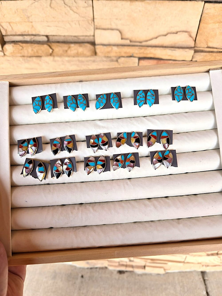 Seriously beautiful Zuni made studs - we have an all Turquoise version, or a variety of unique pairs made from combinations of stones including Blue Turquoise, Red Coral, Jet, White Shell and Pink Shell. So cute!