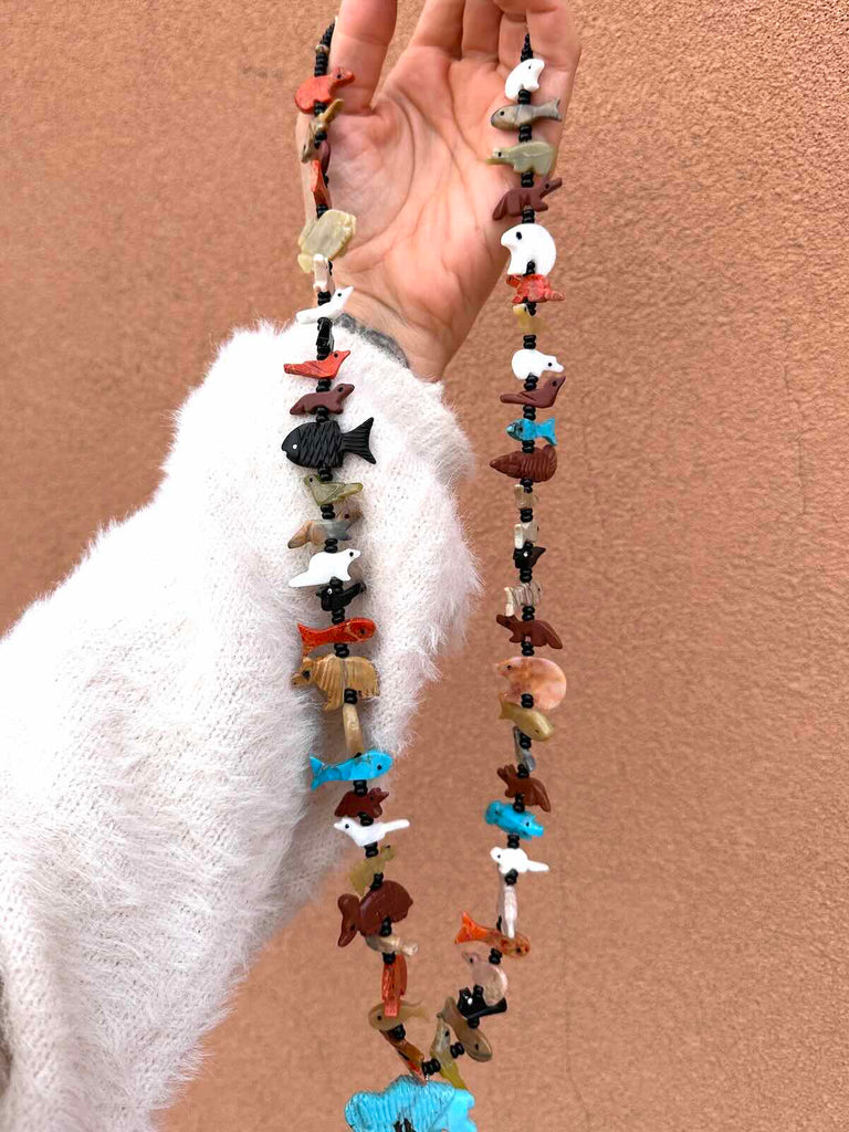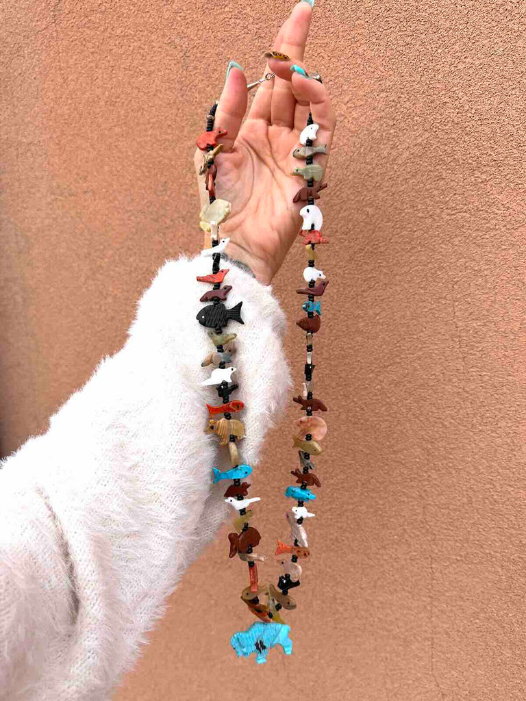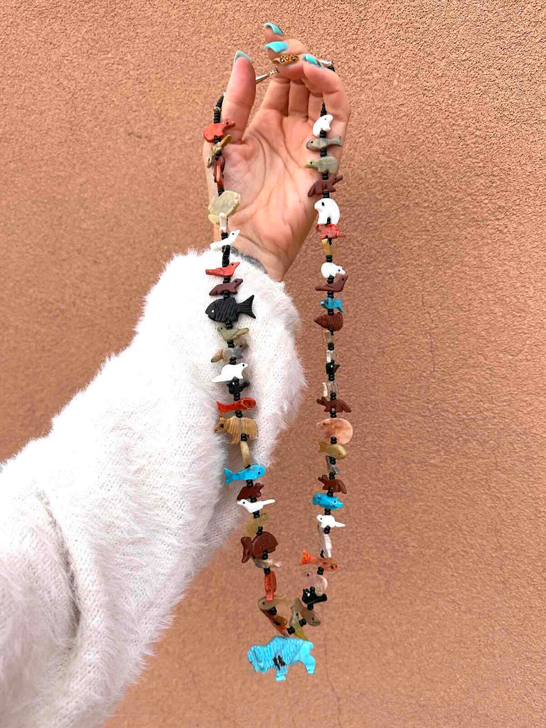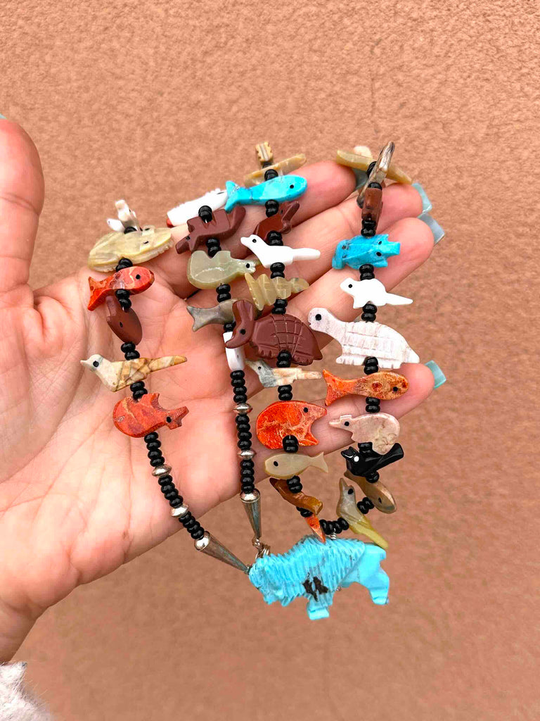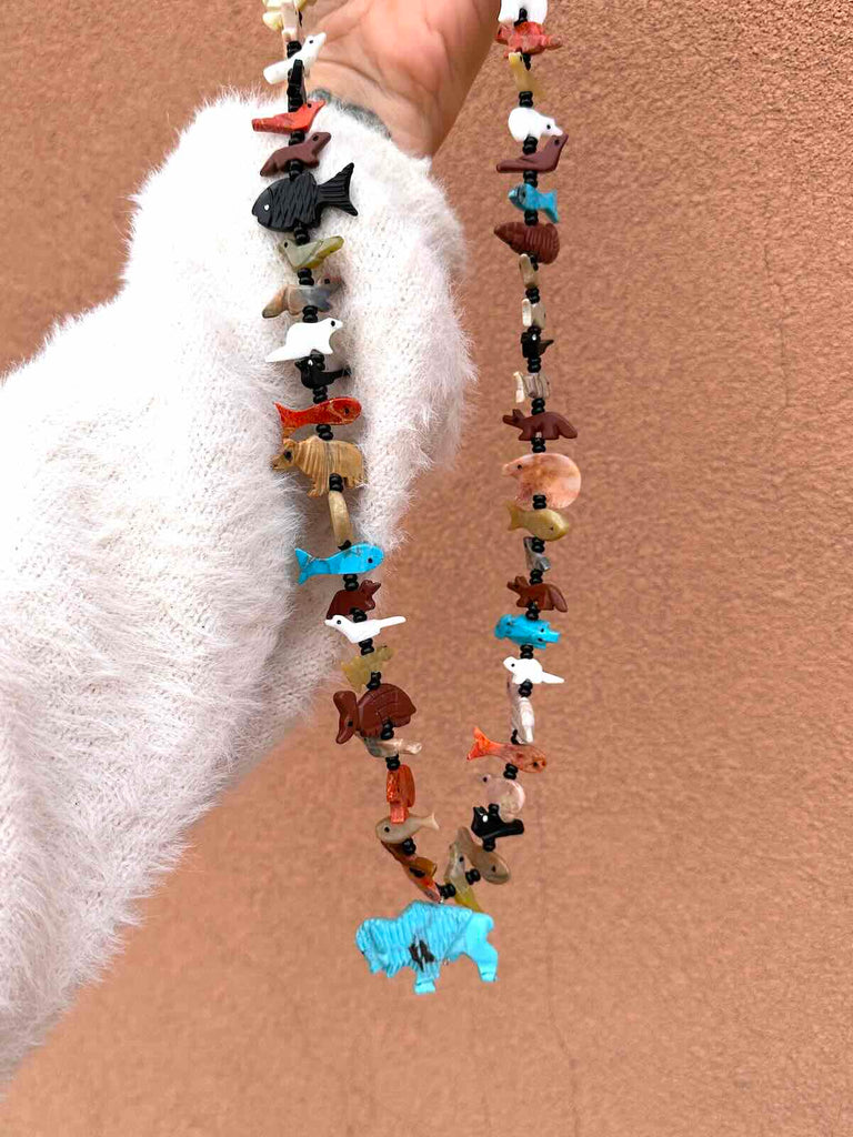 Zuni Fetish necklace with meticulously carved animals from mixed genuine stones including Turquoise, Spiny Oyster and Black Onyx to create an absolutely beautiful piece of wearable art.