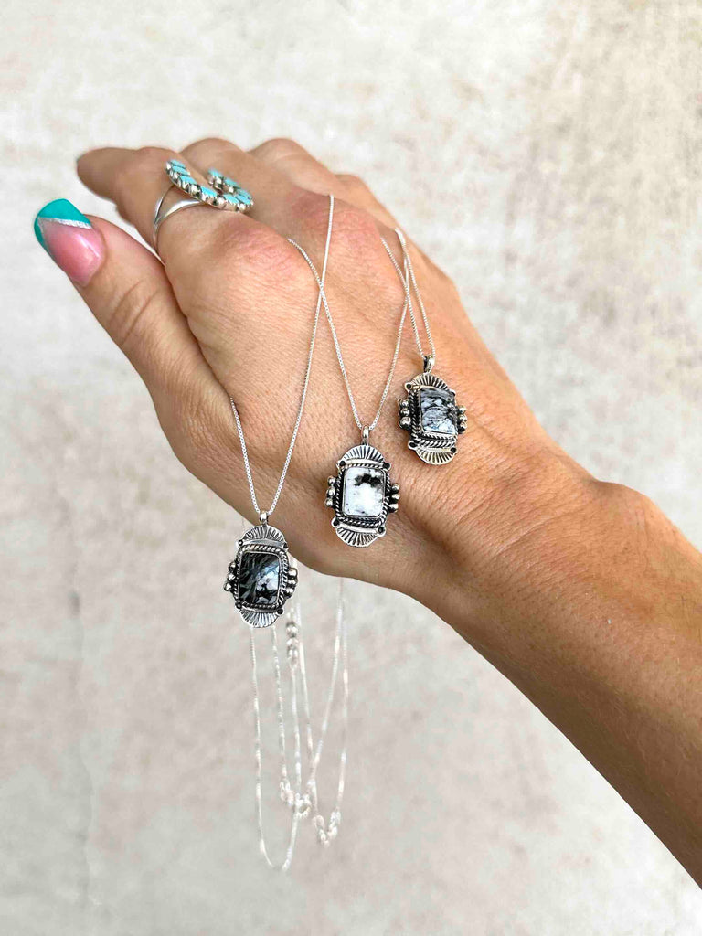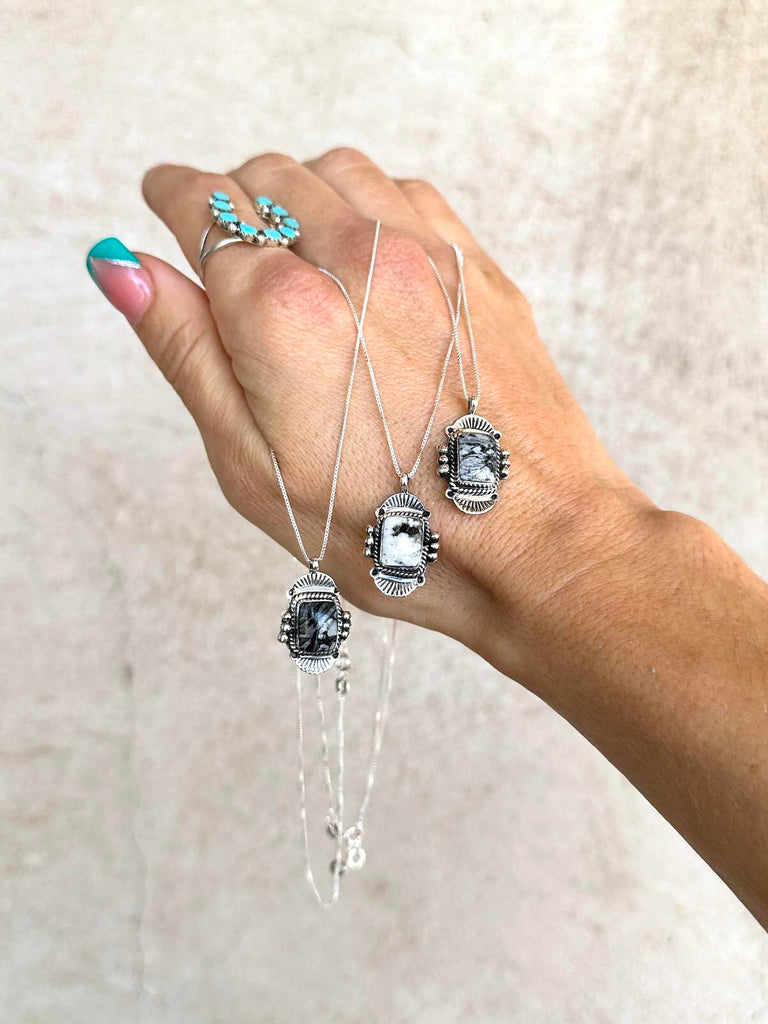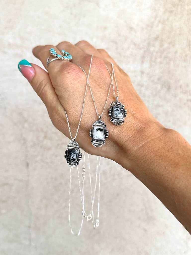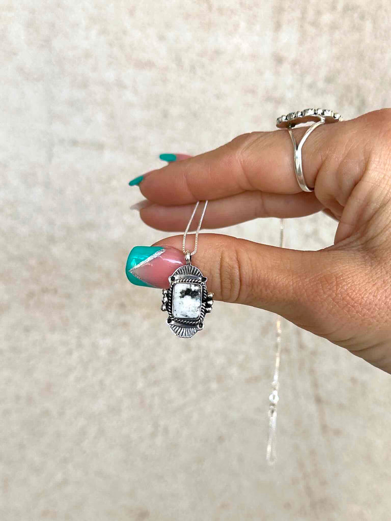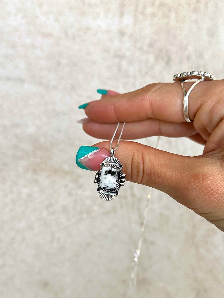 Super sweet square White Buffalo stone pendant set in 925 Sterling Silver and cast on an 18" chain.