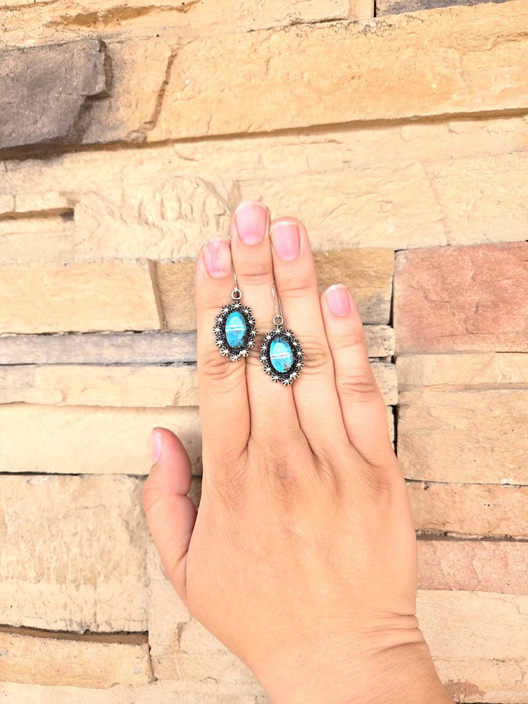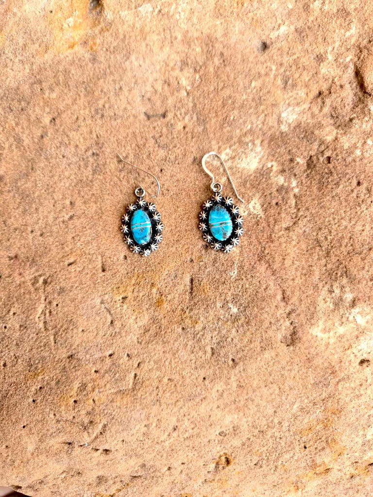 Super sweet drop earrings with inlayed Turquoise oval set in a Sterling Silverwork starburst border.