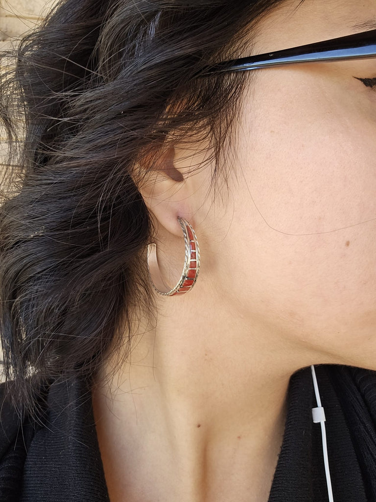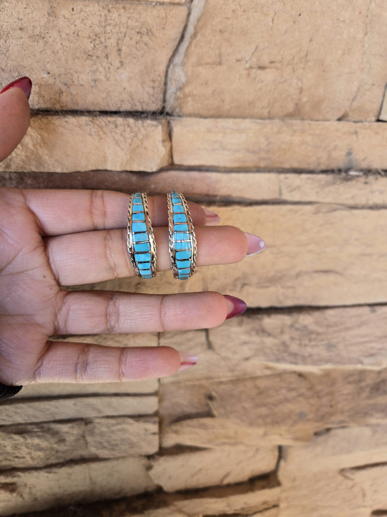 Blue Turquoise, Red Coral, or a mix of Turquoise, Coral, Onyx and Mother of Pearl.