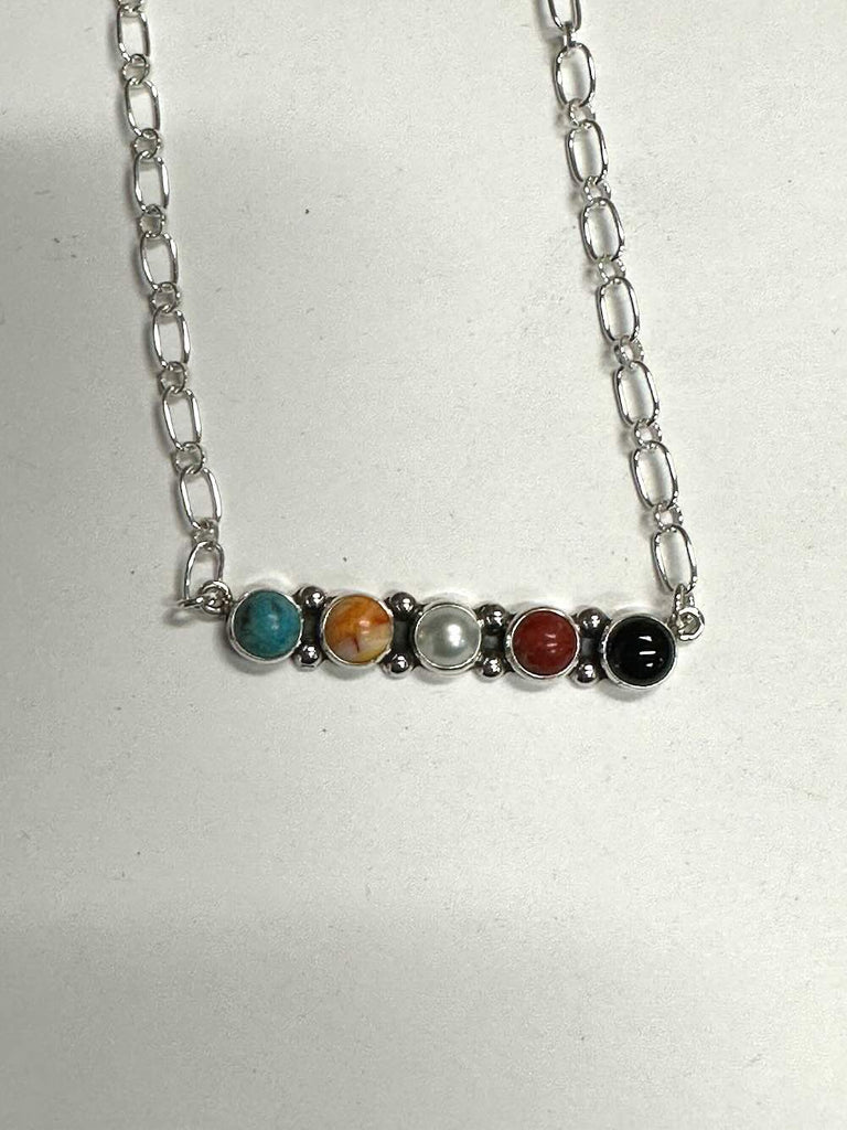 Incredible fresh take on the classic bar necklace design with five circular stones set in a bar of 925 Sterling Silver, on an 20" link chain.