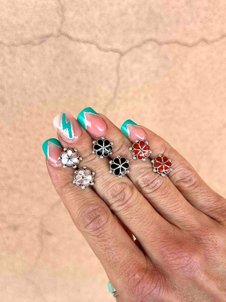 Zuni hand-crafted flower stud earrings - Quality inlay with 6 petals and center stones in your choice of Red Coral, Onyx or Pink Shell.