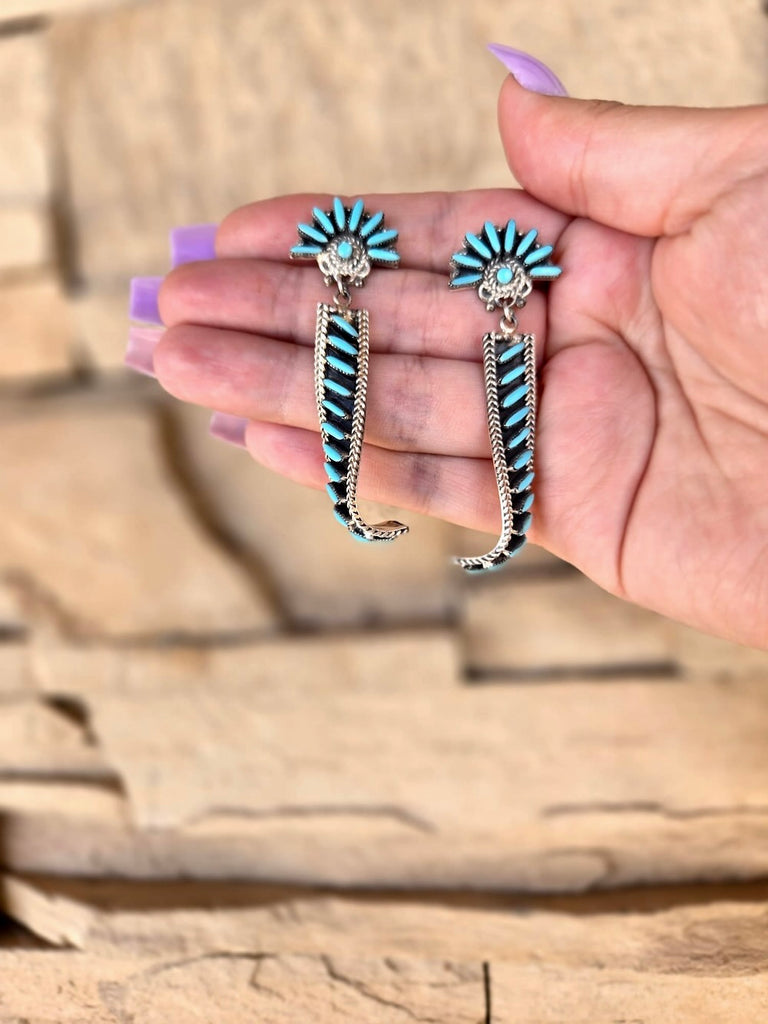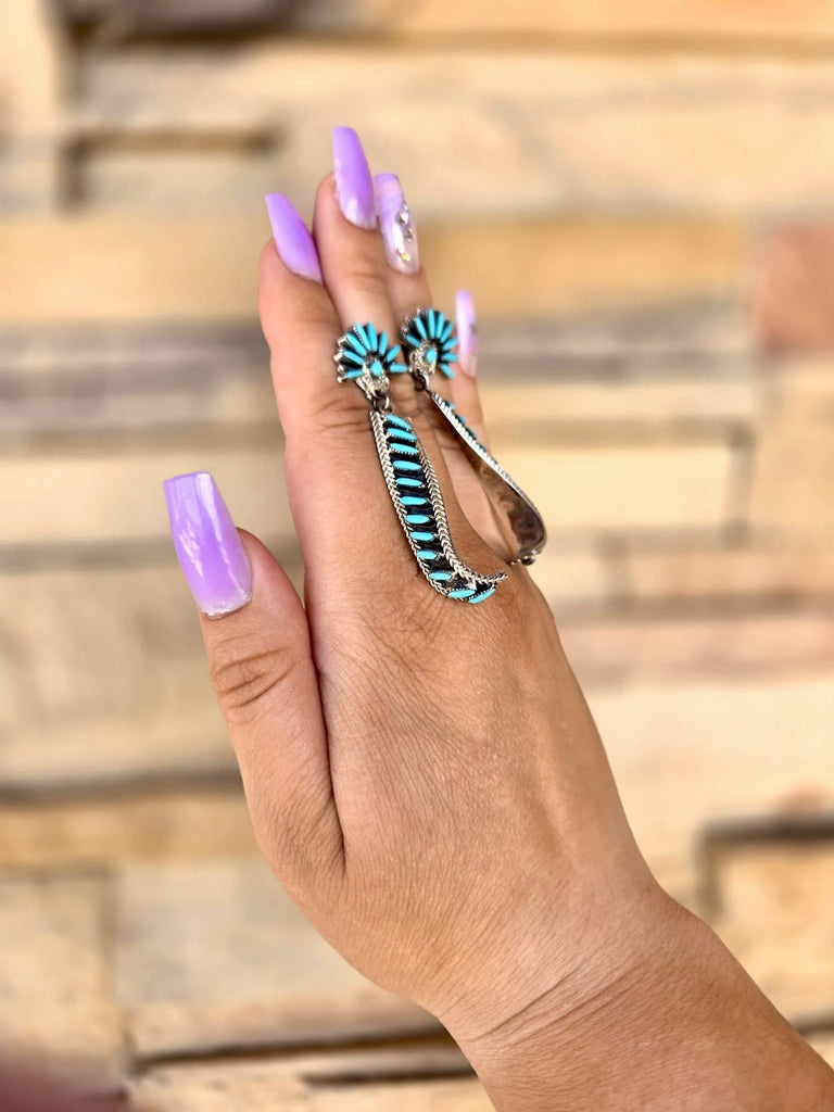 Featuring tiny hand-cut Zuni needlepoint stones with a stunning crescent detail stud, and long spiral Silverwork dangle studded with more tiny Turquoise stones. The time put into creating these is staggering!