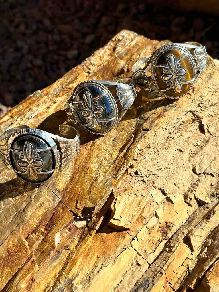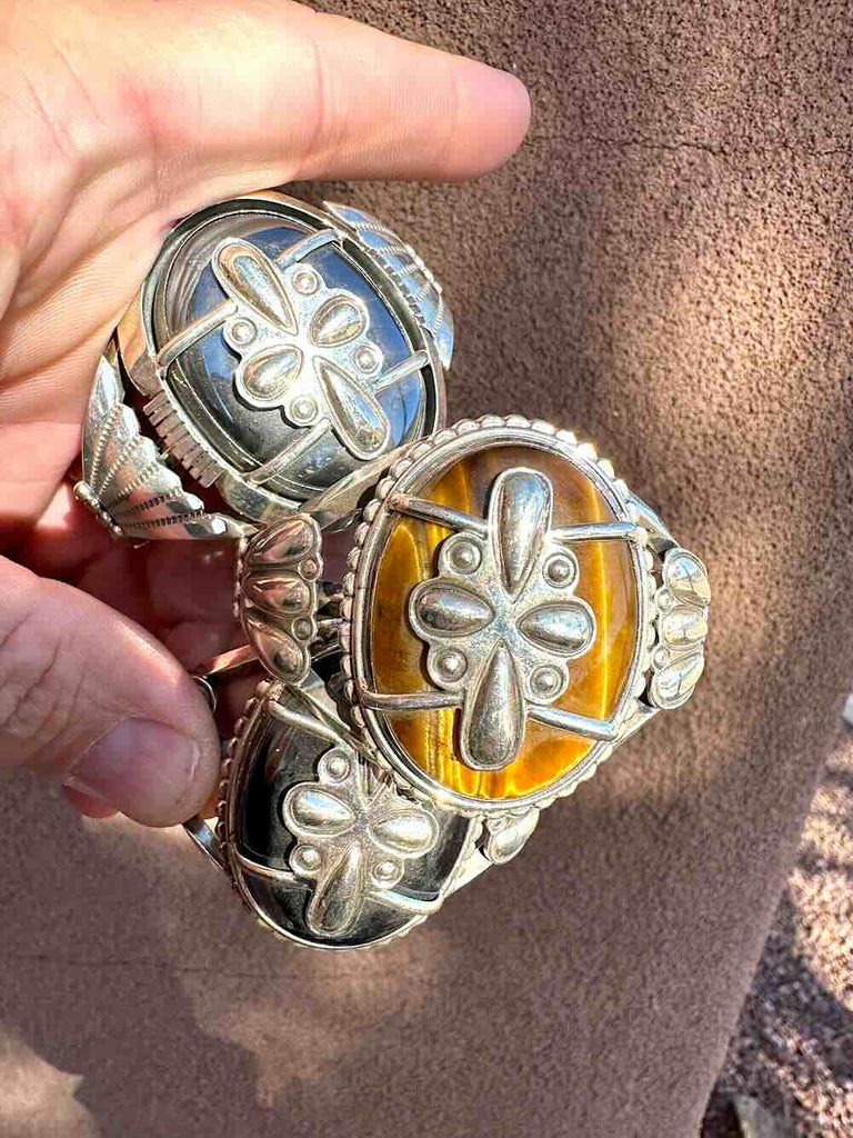 Ornate silverwork adorns your choice of Hematite, or Tigers Eye center stones, this piece has a comforting weight and size and is sure to delight its new owner.