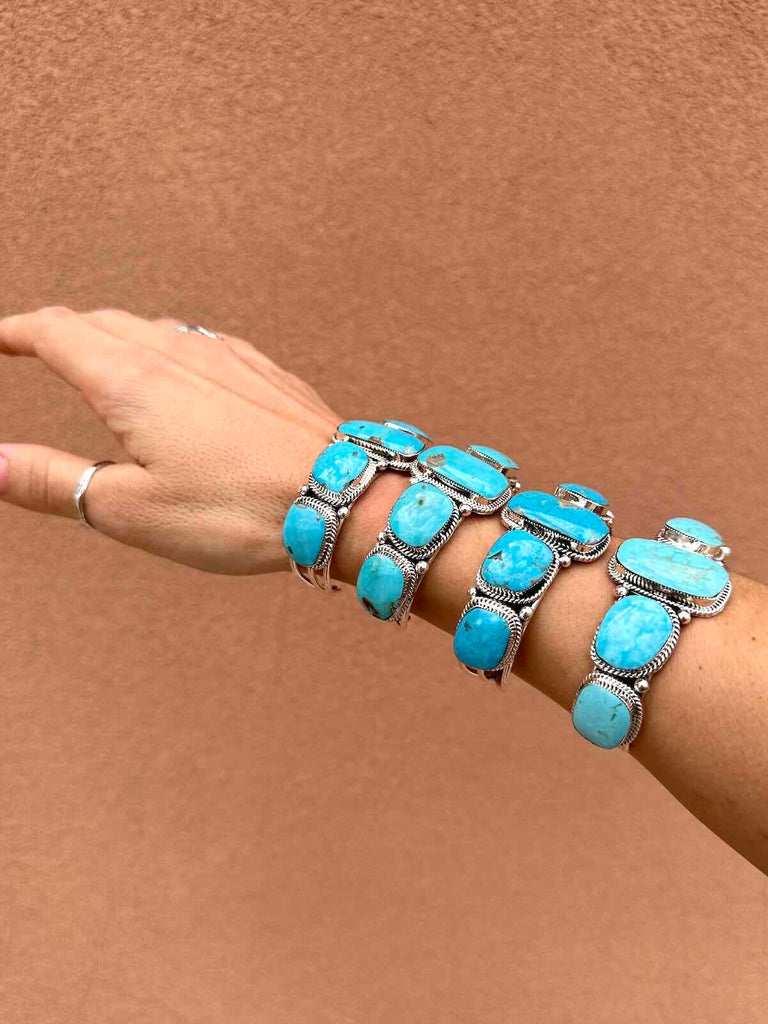 Your choice of 2 handmade Kingman Turquoise cuffs hand-crafted in 92.5% Sterling Silver with 5 hand cut Kingman Turquoise stones.