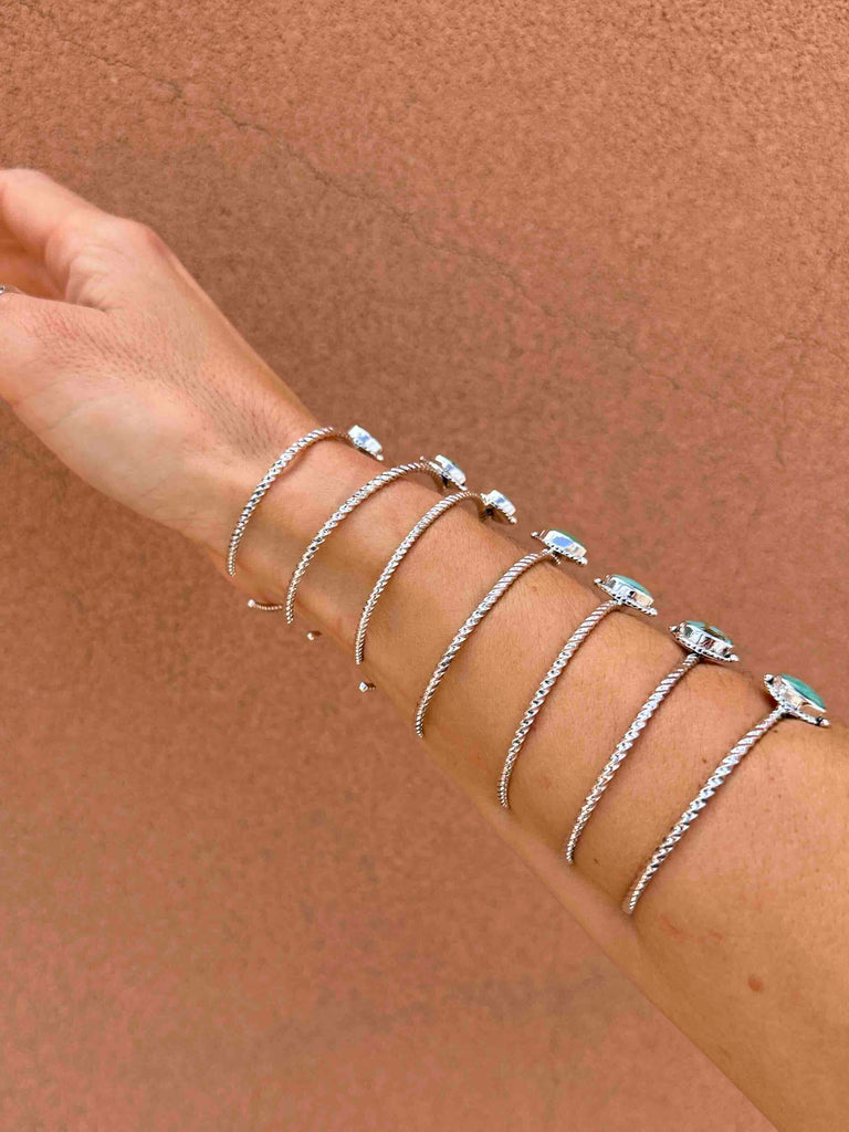 Twisted open back that can be squeezed onto the wrist for a perfect fit!