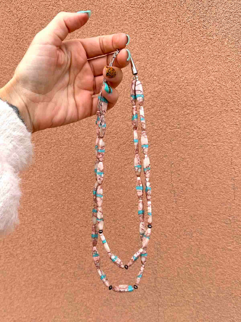 The sweetest necklace of two layers of beautiful Ribbon Rock stone beads featuring turquoise flashes. The double layer is so flattering on and will complement your look any time of day!