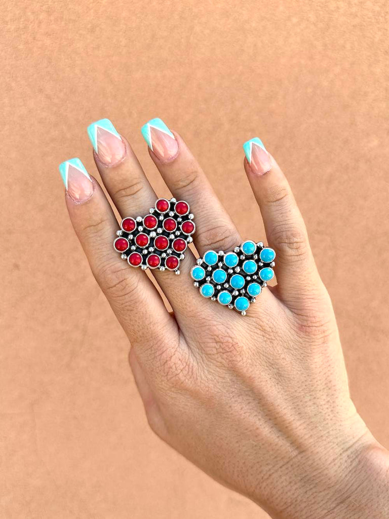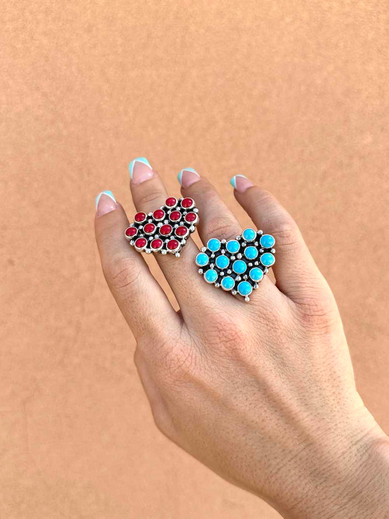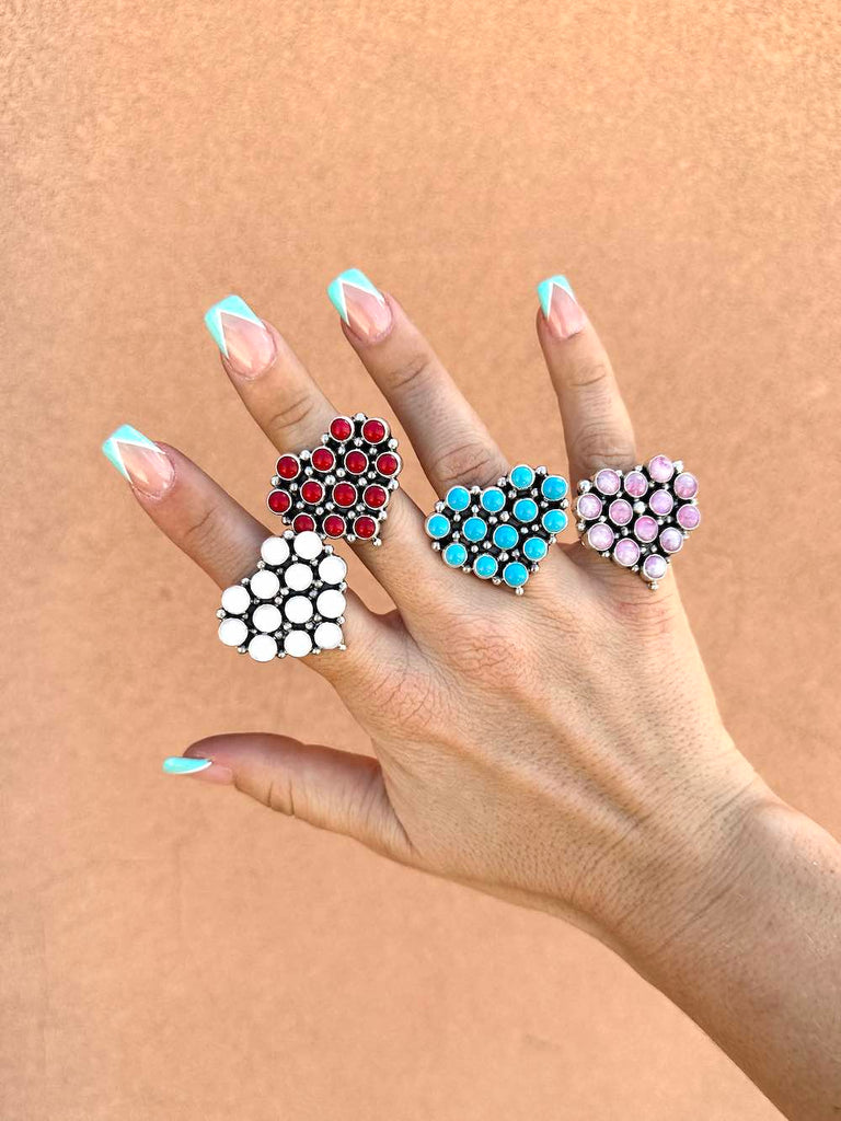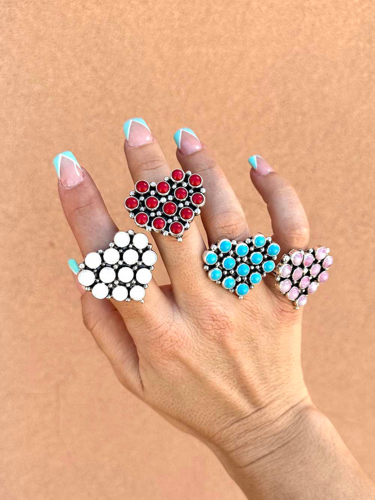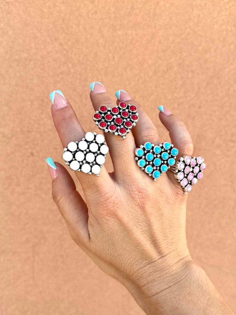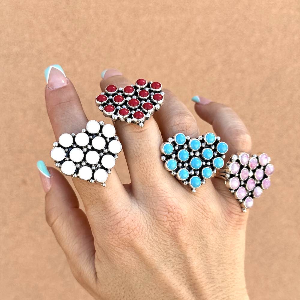 Gorgeous hand-crafted heart shape ring with 13 hand cut and inlaid stones of your choice from either Blue Sleeping Beauty, Red Coral, White Moonstone, or Pink faux opal.