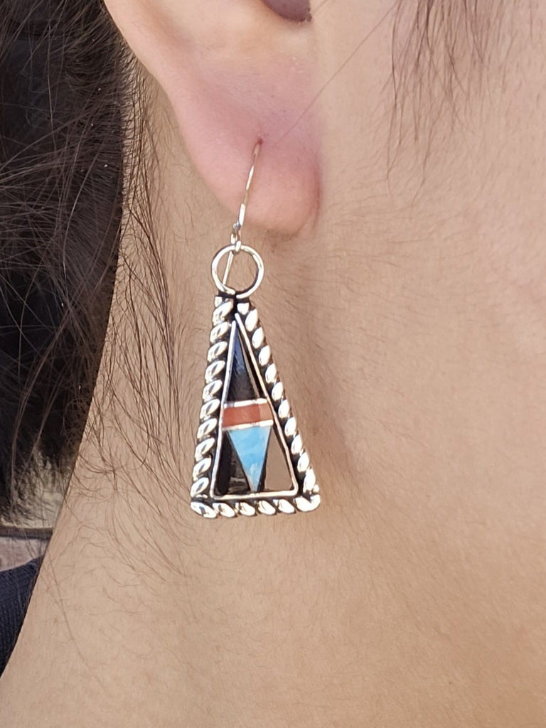 Incredibly striking triangular earrings crafted from fine traditional Zuni inlay of Turquoise, Onyx and Red Coral.