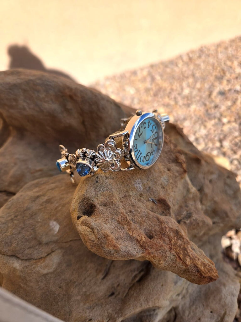 Ooh this one is special! Sterling Silver bracelet style watchband with incredible detailed silverwork embellished with Swiss Blue Topaz and Blue Turquoise stones.