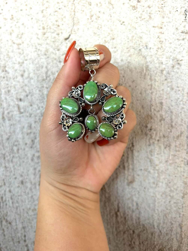 Stunningly detailed 925 Sterling Silver Naja pendant adorned with 6 glorious Mexican Agave Green Turquoise stones and embellished silverwork including sweet little flowers.
