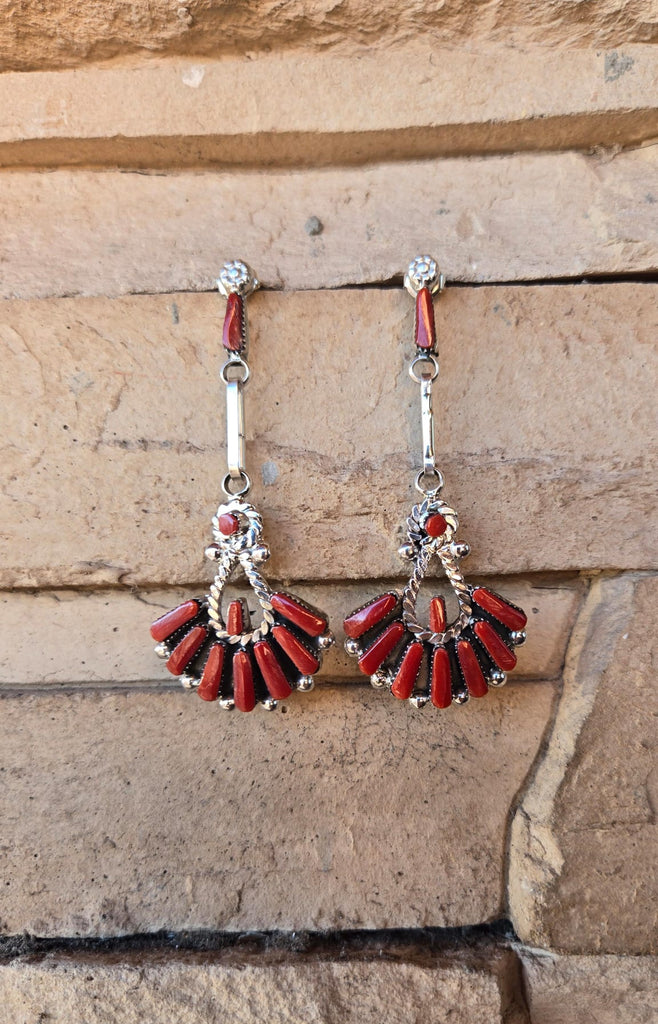 Glorious sparkling dangly Zuni made earrings painstakingly hand-crafted in Red Coral and 925 Sterling Silver.