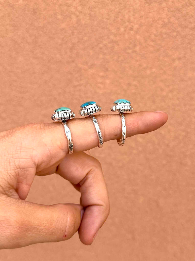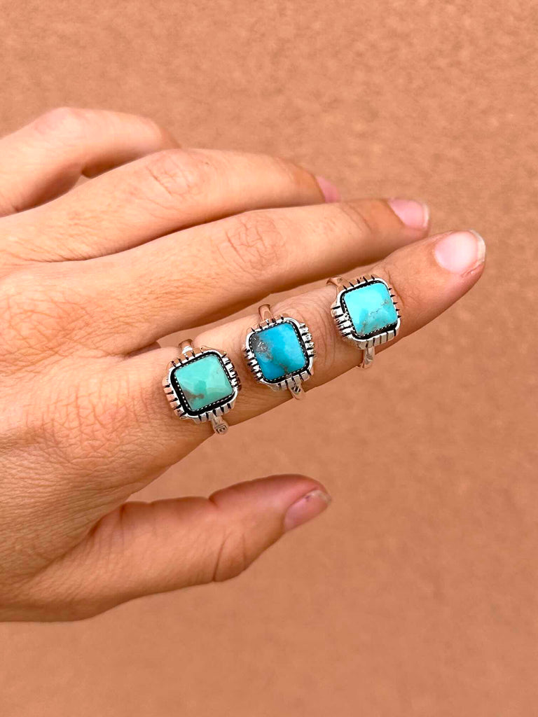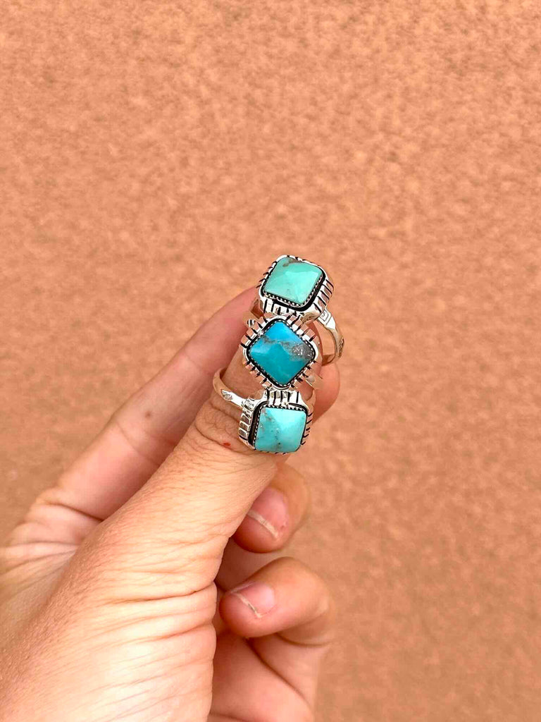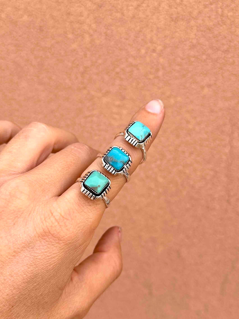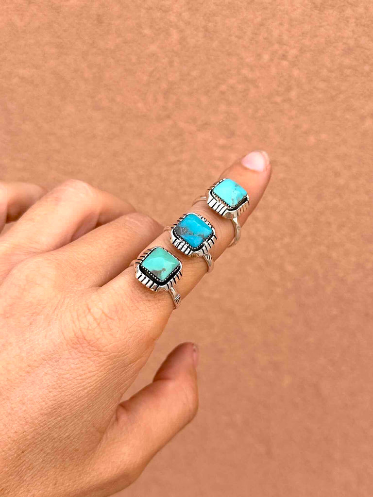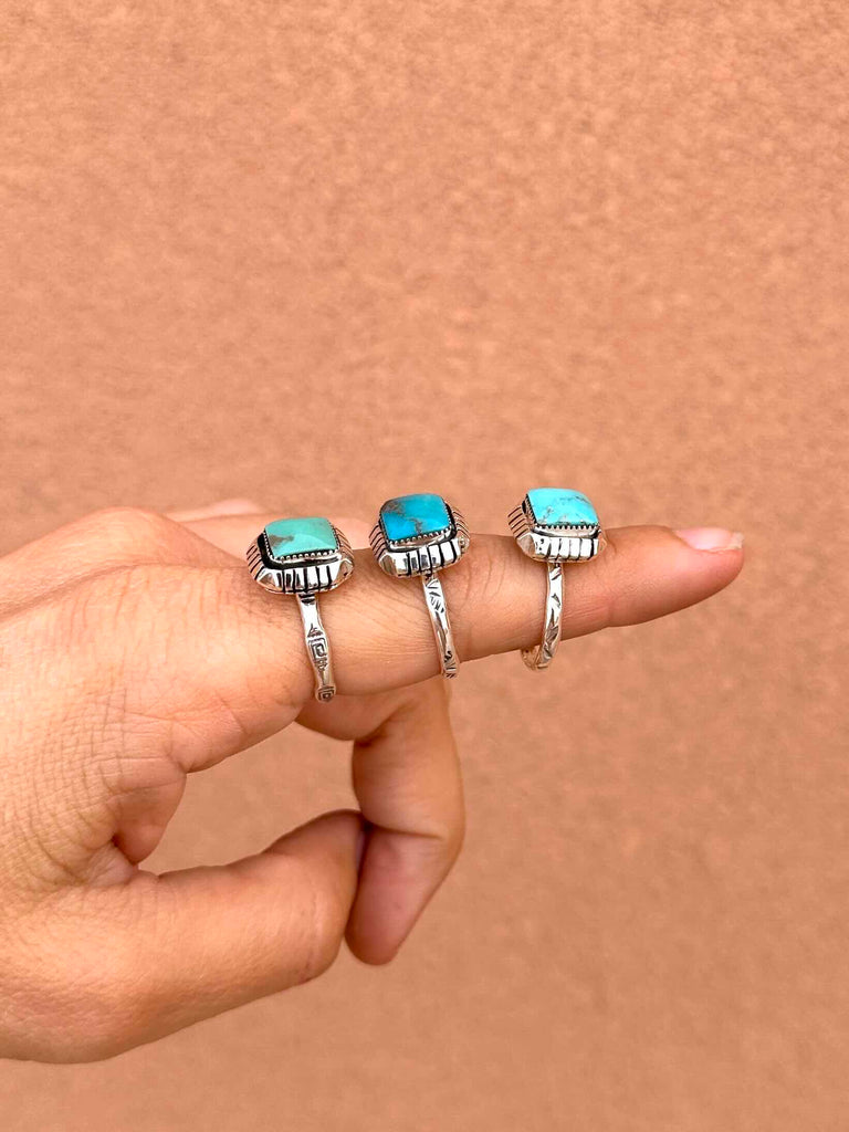 We love a good square Turquoise solitaire and the beautiful patterned silverwork framing this beauty really elevates the whole look. The Turquoise stones used here are just STUNNING!