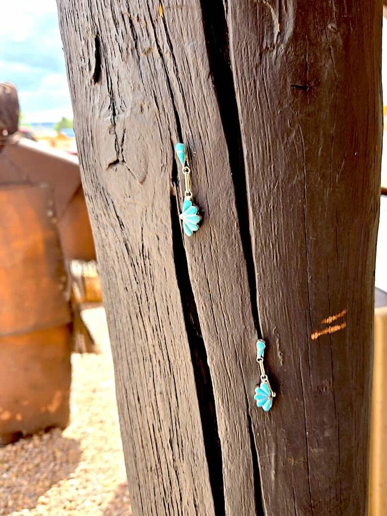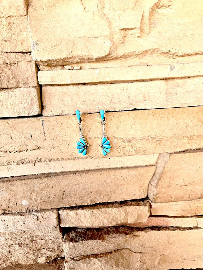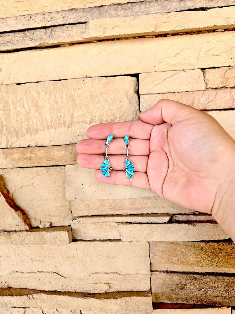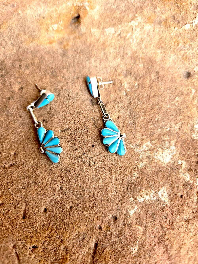 With a Blue Turquoise teardrop shaped stud stone, with a fan motif drop set with more Blue Turquoise stones. Light-weight but still such an eye-catching design!