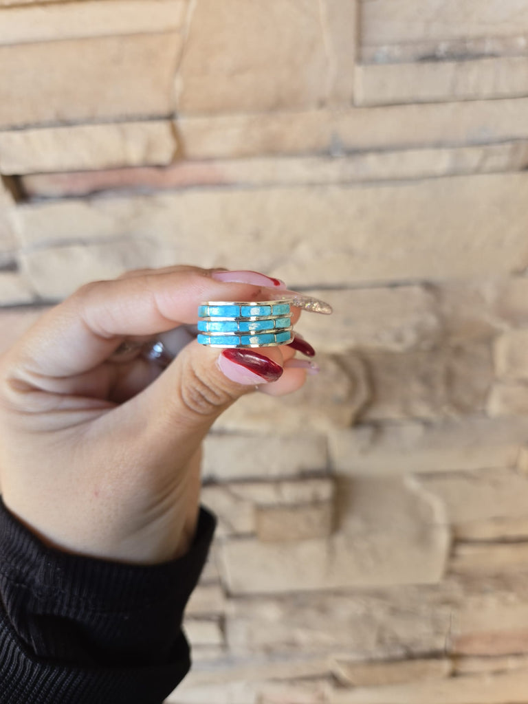 Absolutely BEAUTIFUL ring with three rows of tiny hand inlaid stones in your choice of Onyx, Pink Oyster Shell or Blue Turquoise.