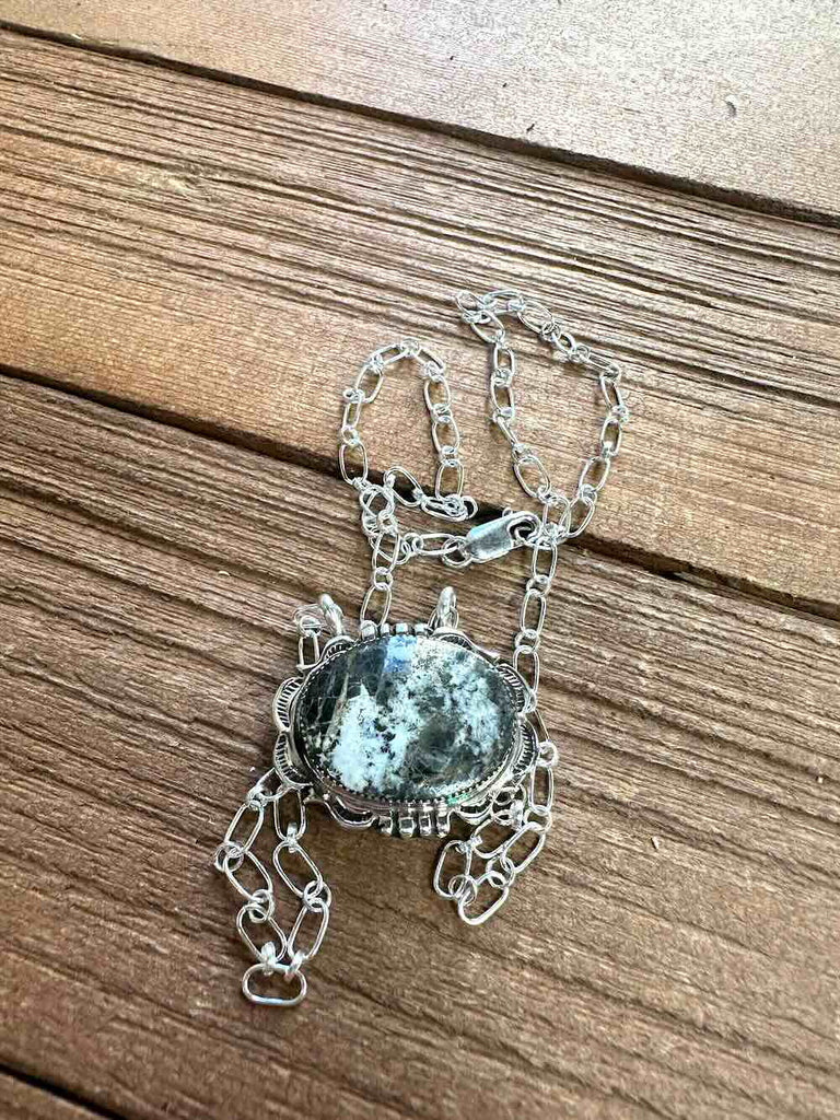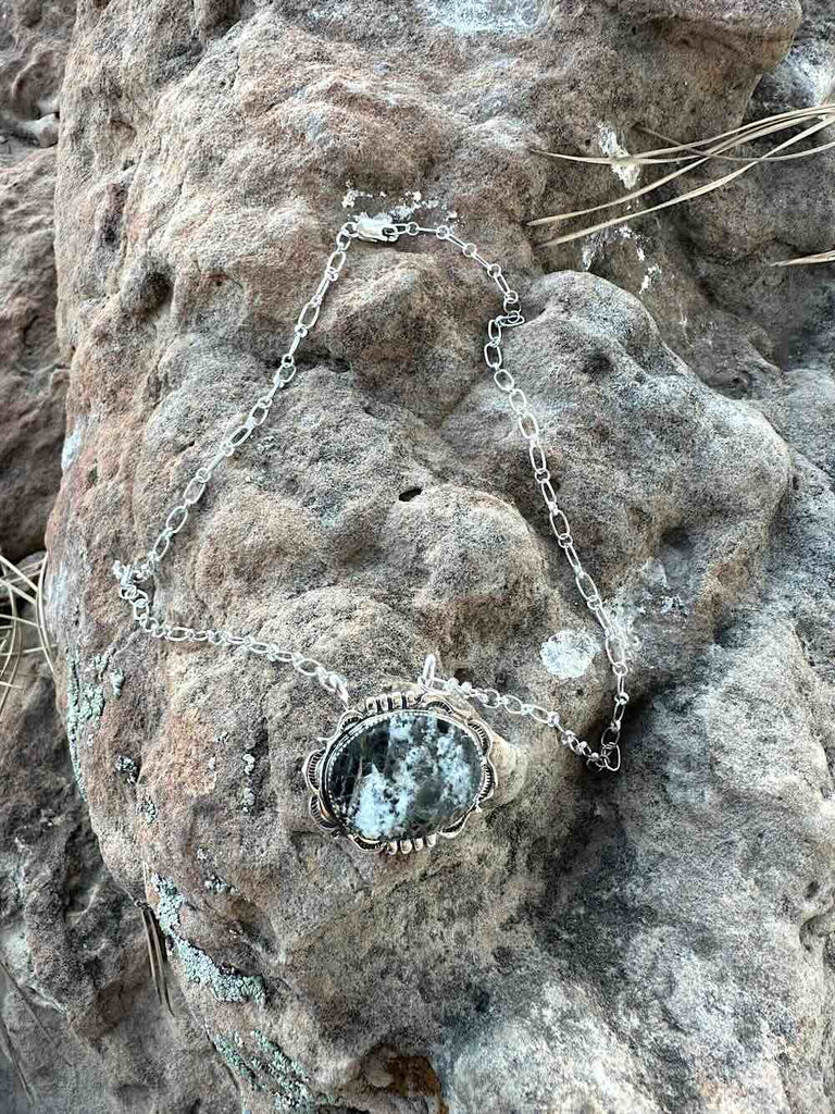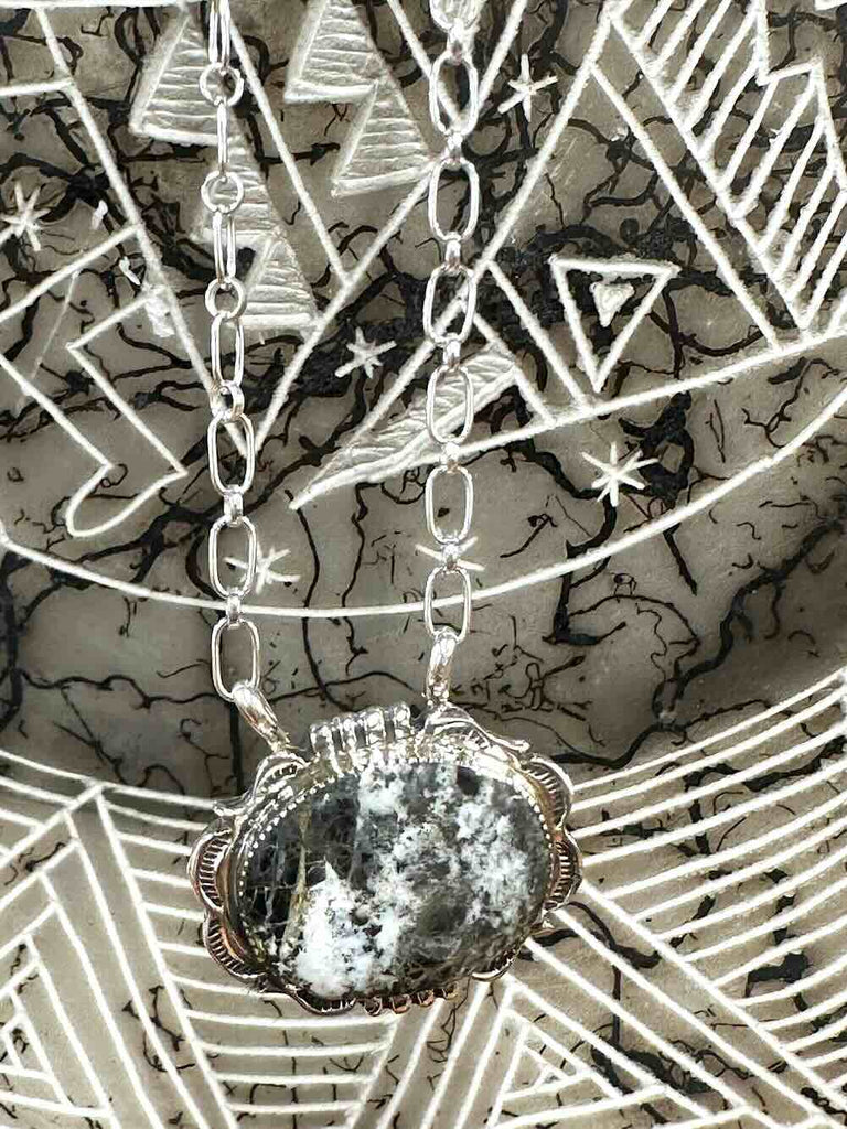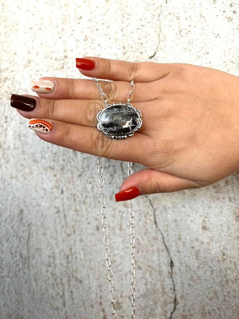 Gorgeous large polished White Buffalo stone set in embellished 925 Sterling Silver and on a gorgeous 20" silver chain.