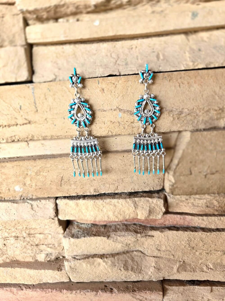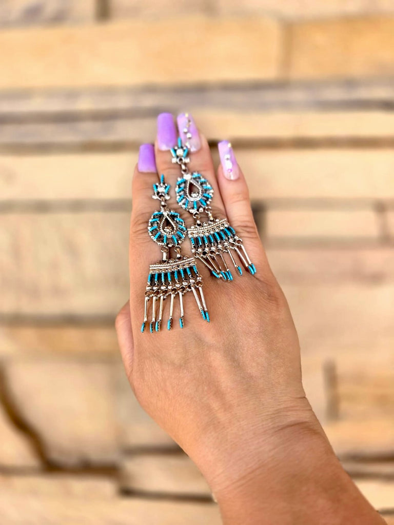 Unbelievable Zuni made statement chandelier earrings. Traditional Zuni needlepoint Turquoise stones are arranged painstakingly to create this showstopping style, perfect for adding a lil fun to any outfit!