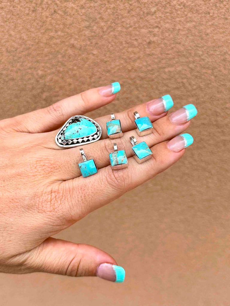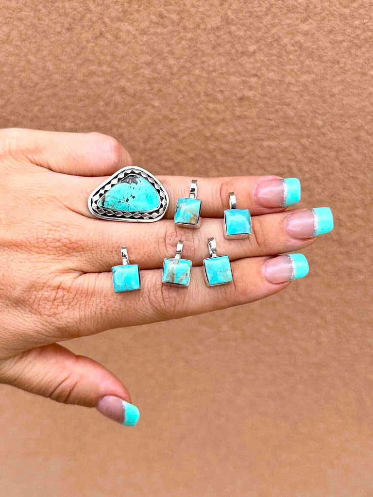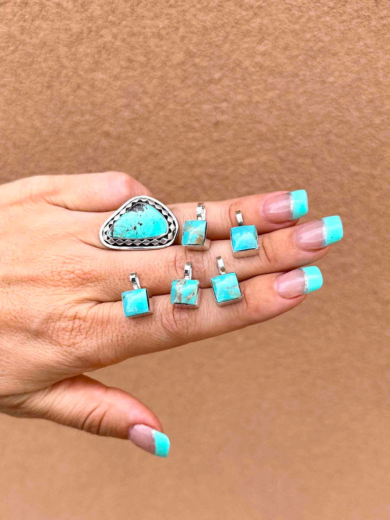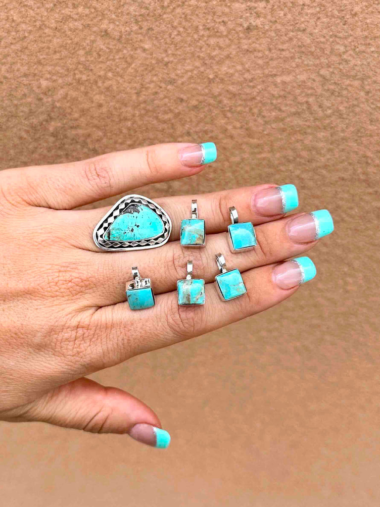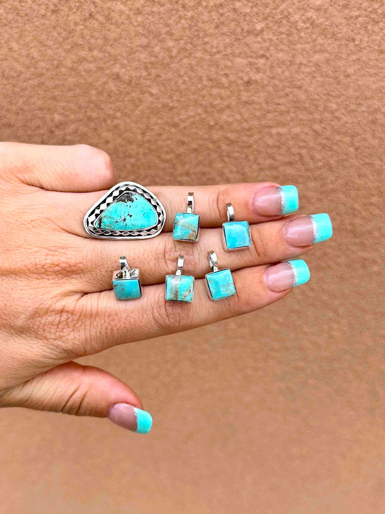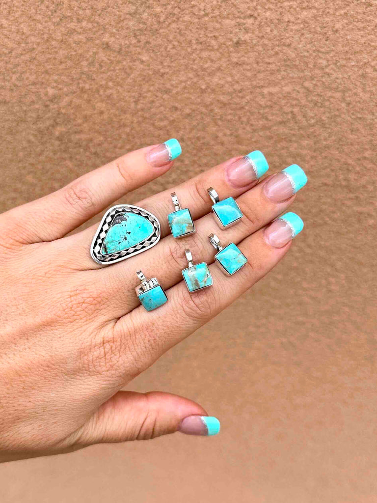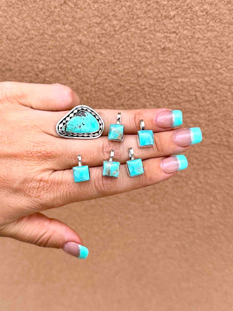 Square cut Turquoise stone with 925 Sterling Silver work, and 16" box chain.