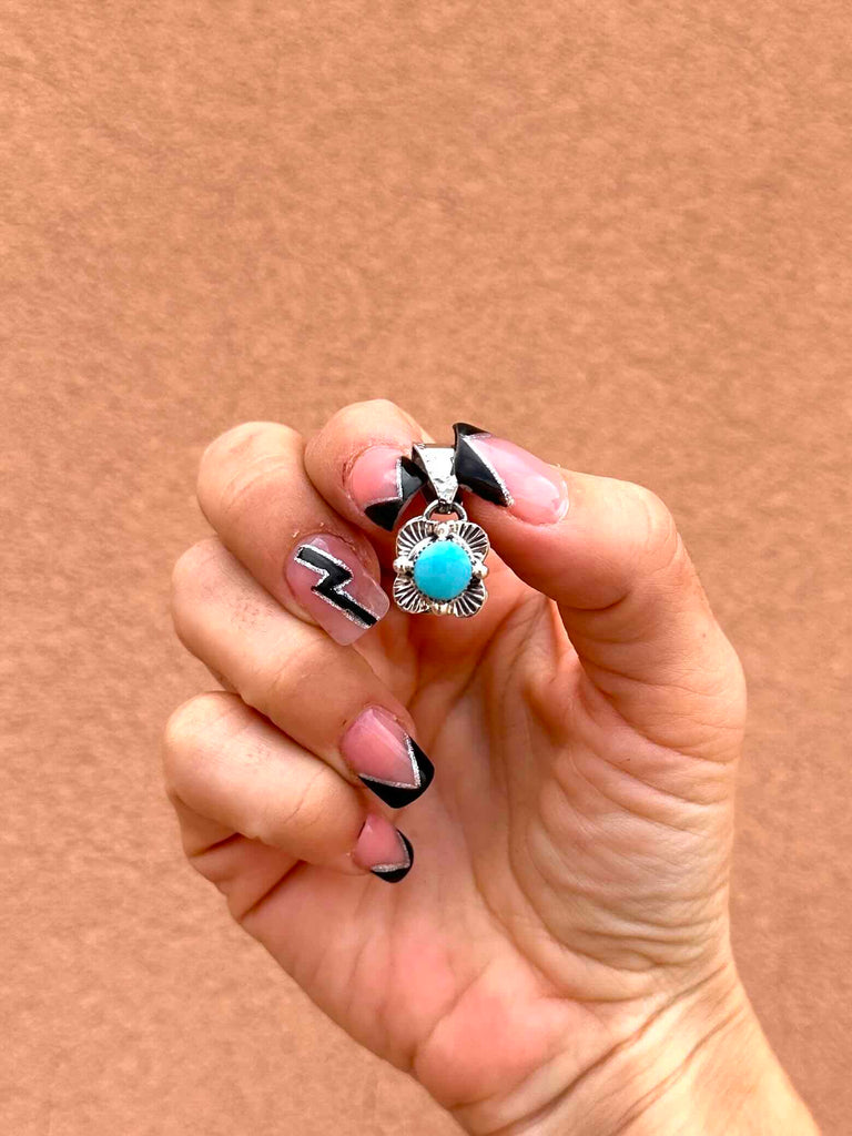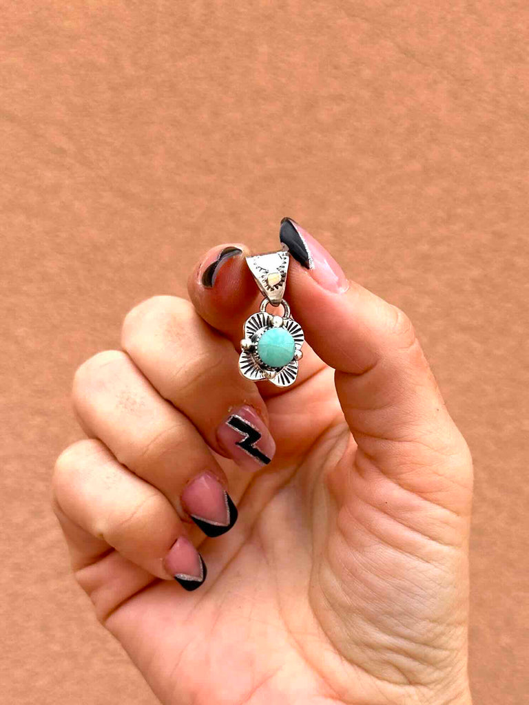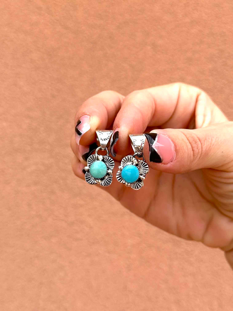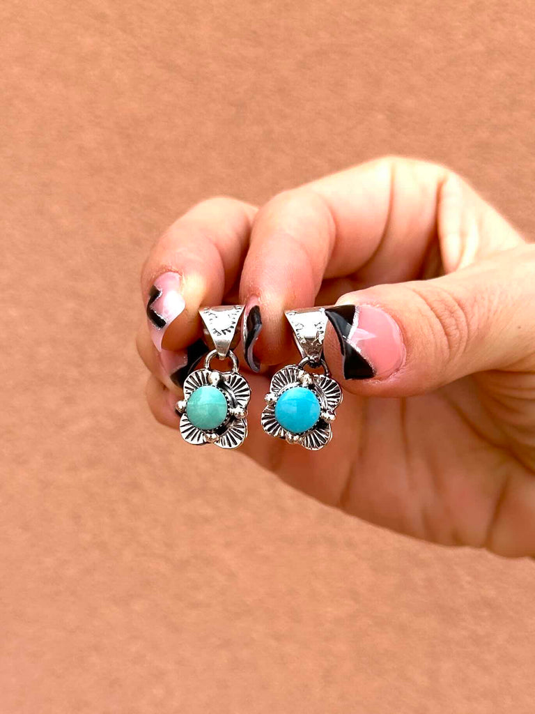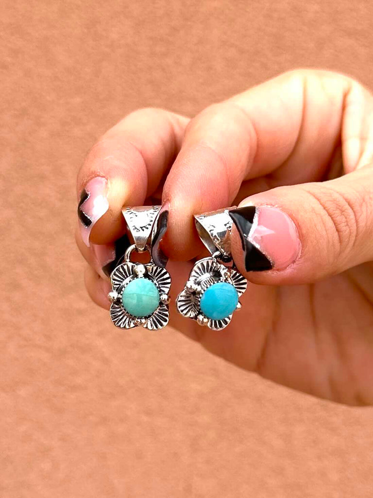 Sweet little 4 petal flower pendants in 925 Sterling Silver with center genuine Turquoise stone.