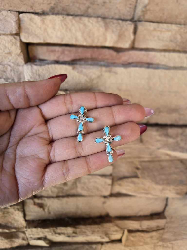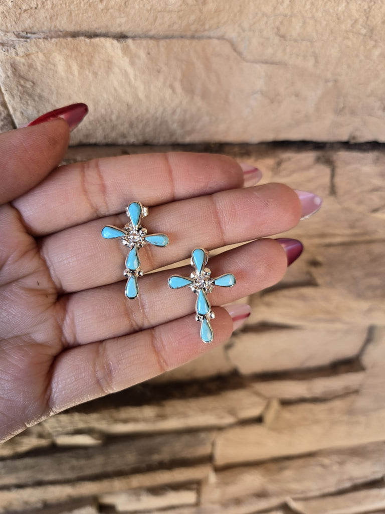 Adorable genuine Turquoise and 925 Sterling Silver cross stud earrings