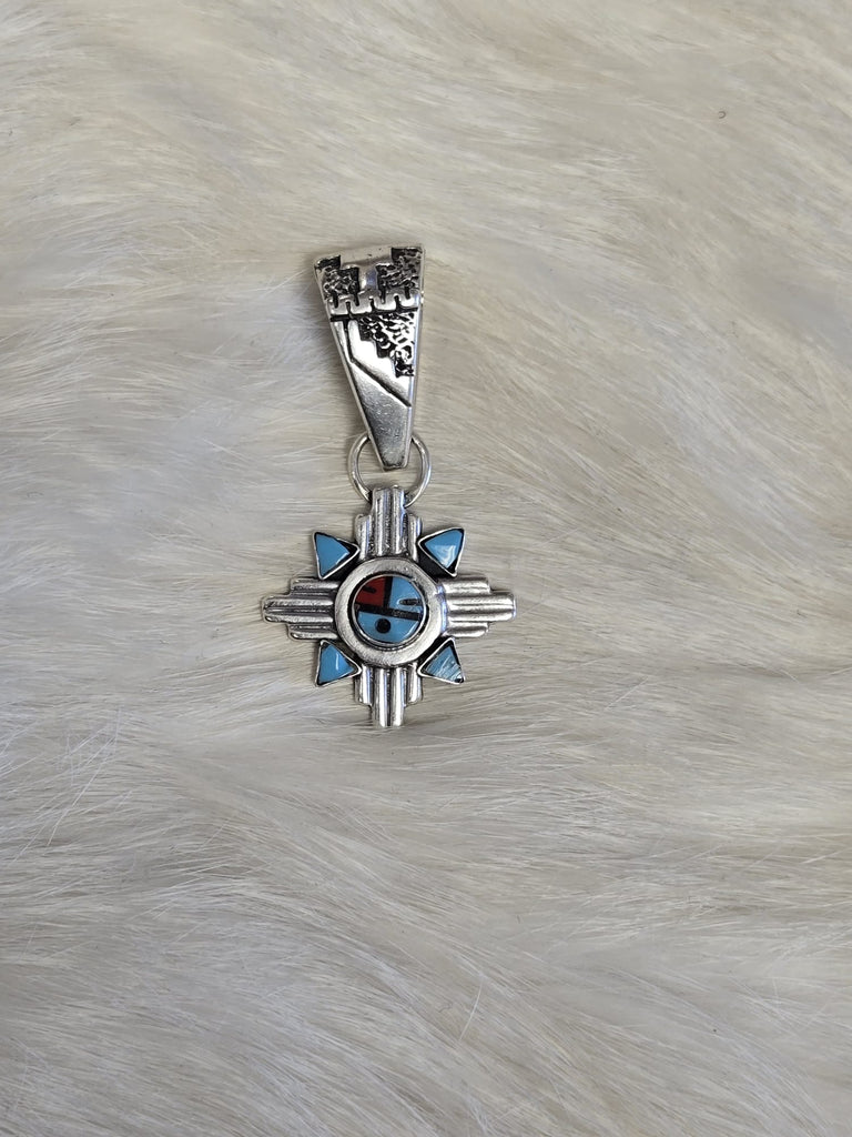Stunning Zuni made Sunface pendant, crafted from 925 Sterling Silver and embedded with tiny hand-cut Turquoise, Red Coral and Onyx. Super special piece.
