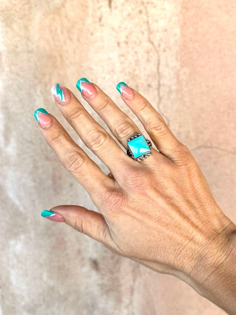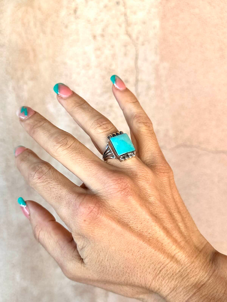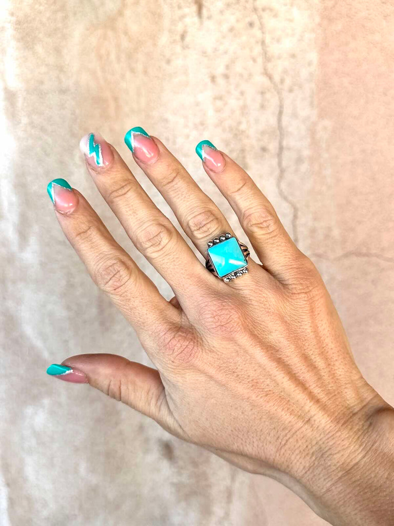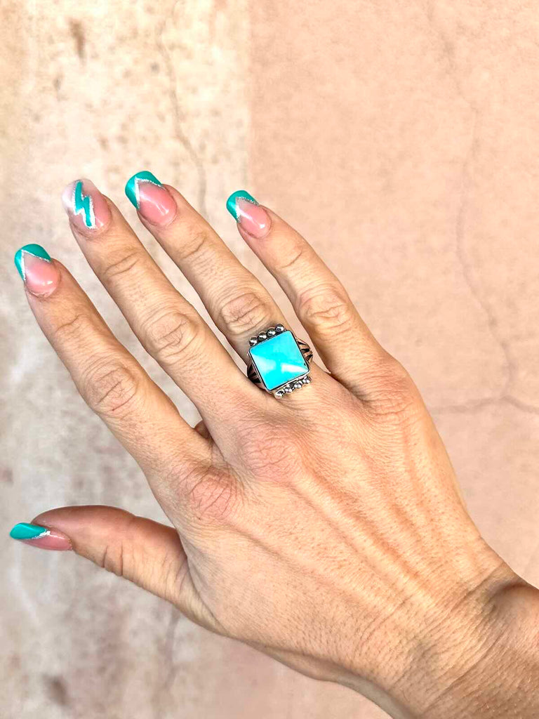 925 Sterling Silver Navajo ring with stunning square Campitos Turquoise stone capped with silver starbursts on a pronged band.