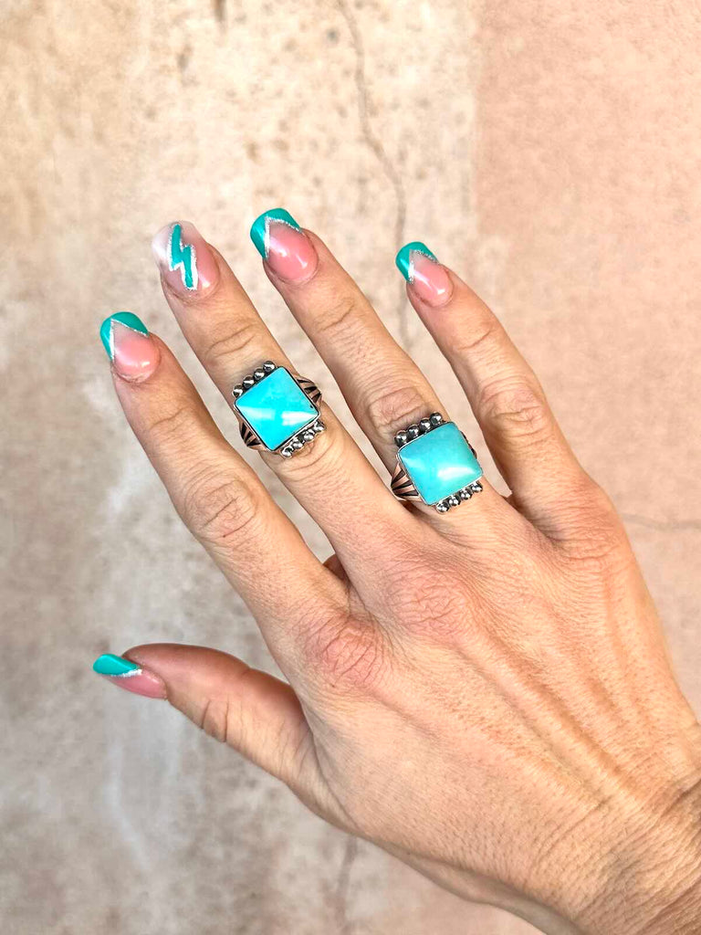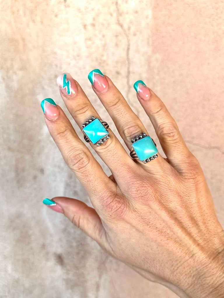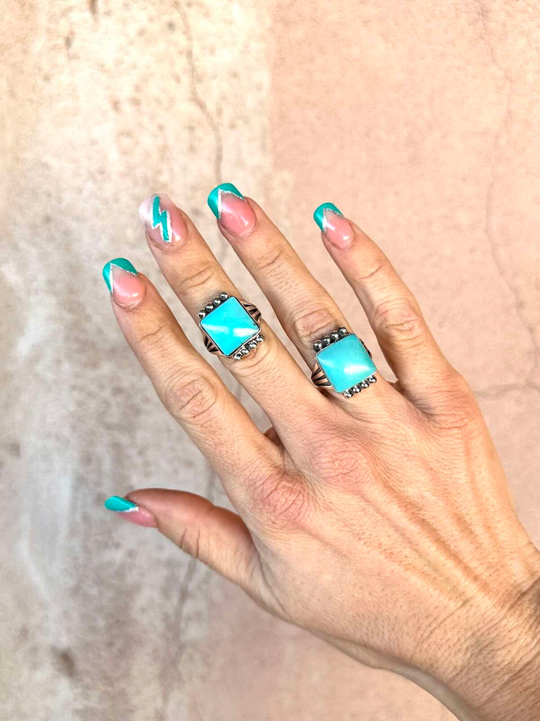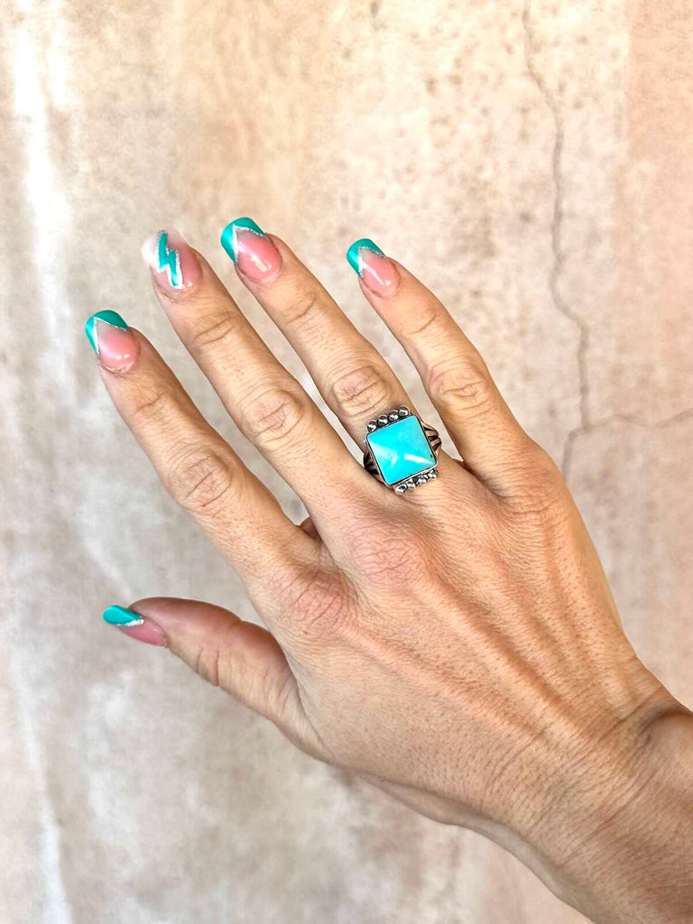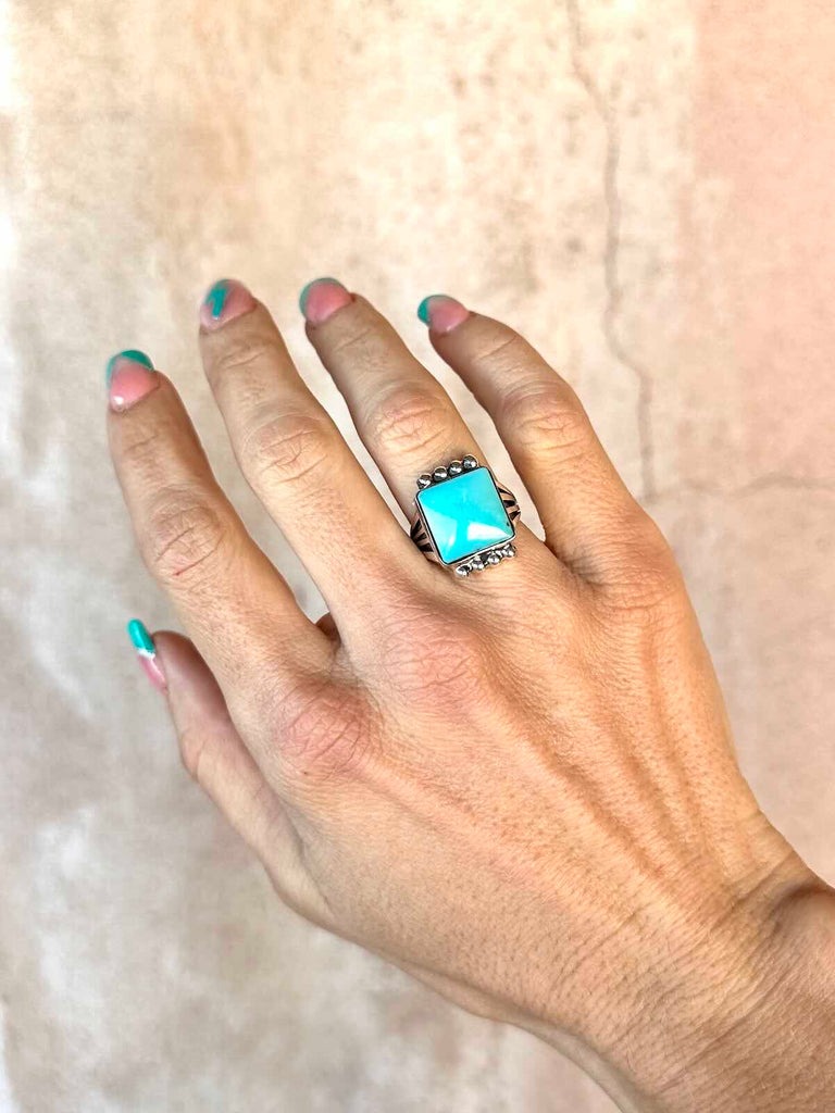 925 Sterling Silver Navajo ring with stunning square Campitos Turquoise stone capped with silver starbursts on a pronged band.