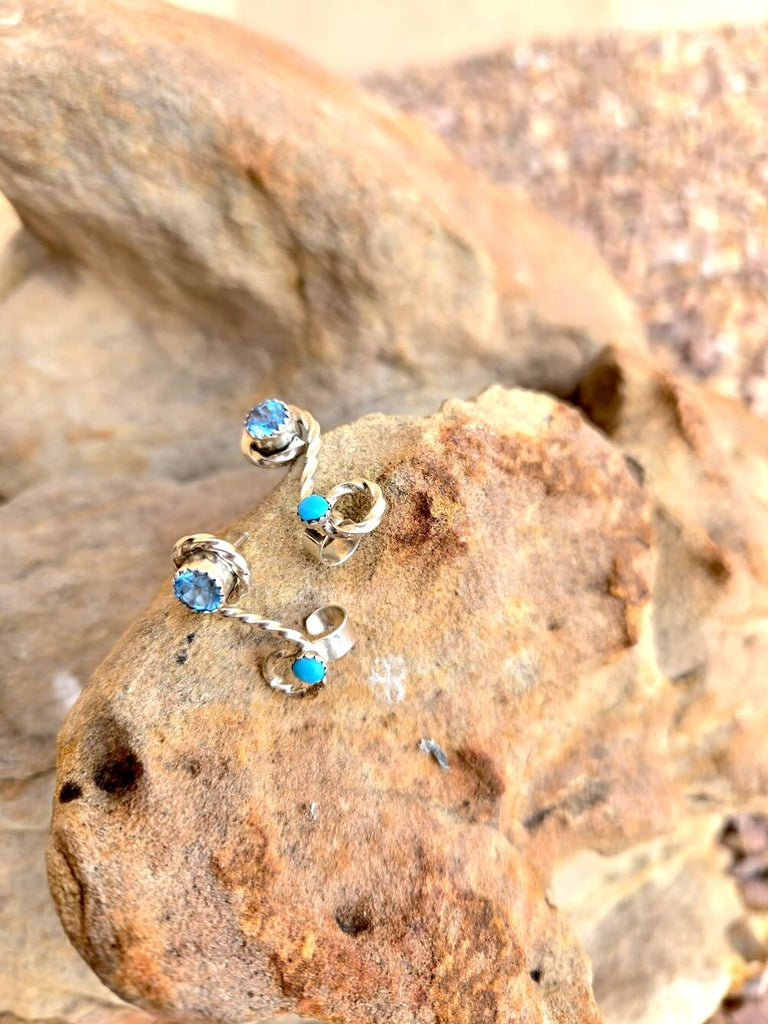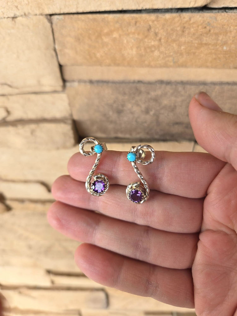 Super sweet Sterling Silver filigree swirl earrings - with small Blue Turquoise stones at the top and your choice of either Swiss Blue Topaz or Amethyst faceted stones beneath.